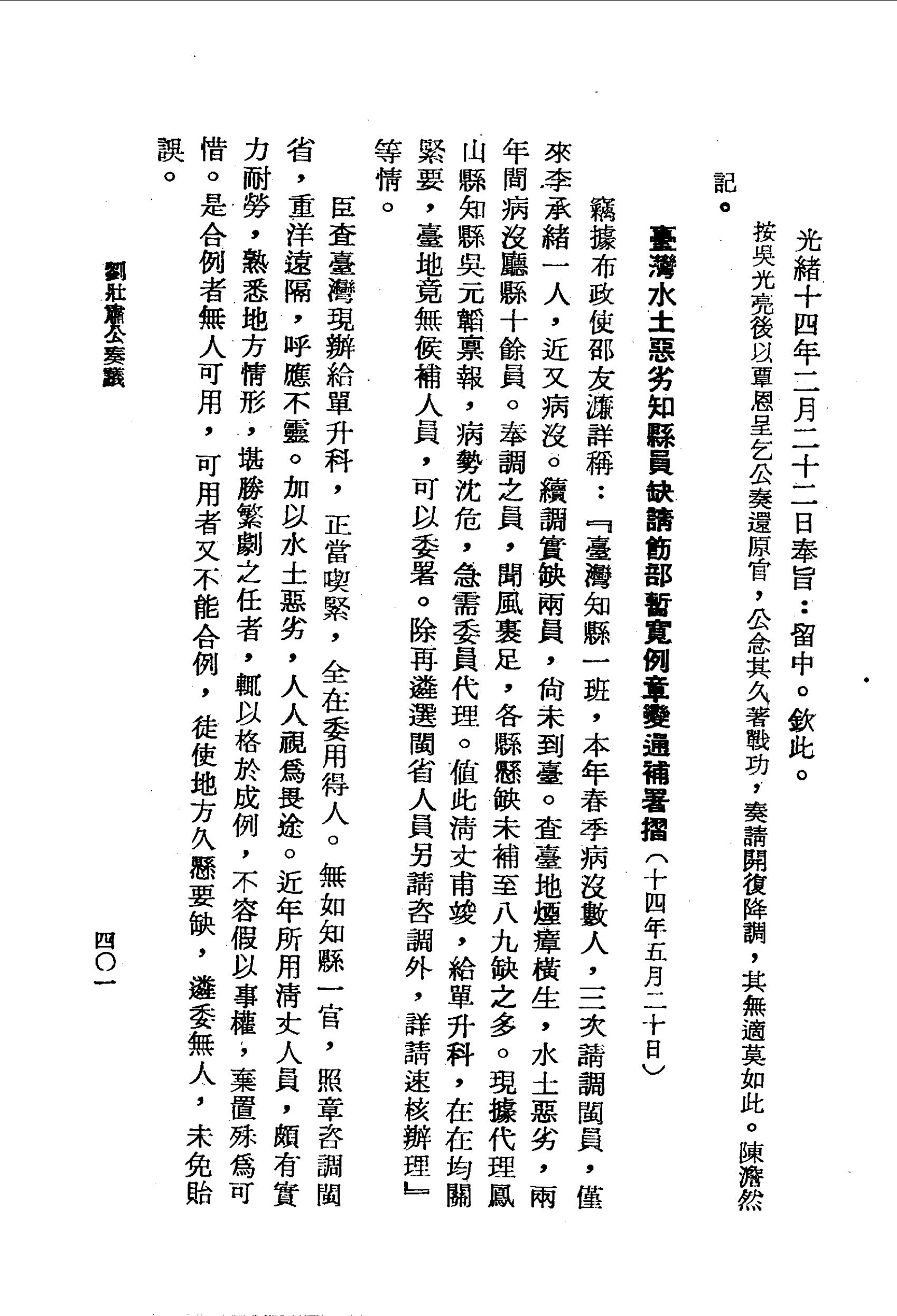 臣查臺灣現辦給單升科,正當喫緊,全在委用得人。無如知縣一官,照章咨調閩省,重洋遠隔,呼應不靈。加以水土惡劣,人人視為畏途。近年所用清丈人員,頗有實力耐勞,熟悉地方情形,堪勝繁劇之任者,輒以格於成例,不容假以事權,棄置殊為可惜。是合例者無人可用,可用者又不能合例,徒使地方久懸要缺,遴委無人,未免貽誤。