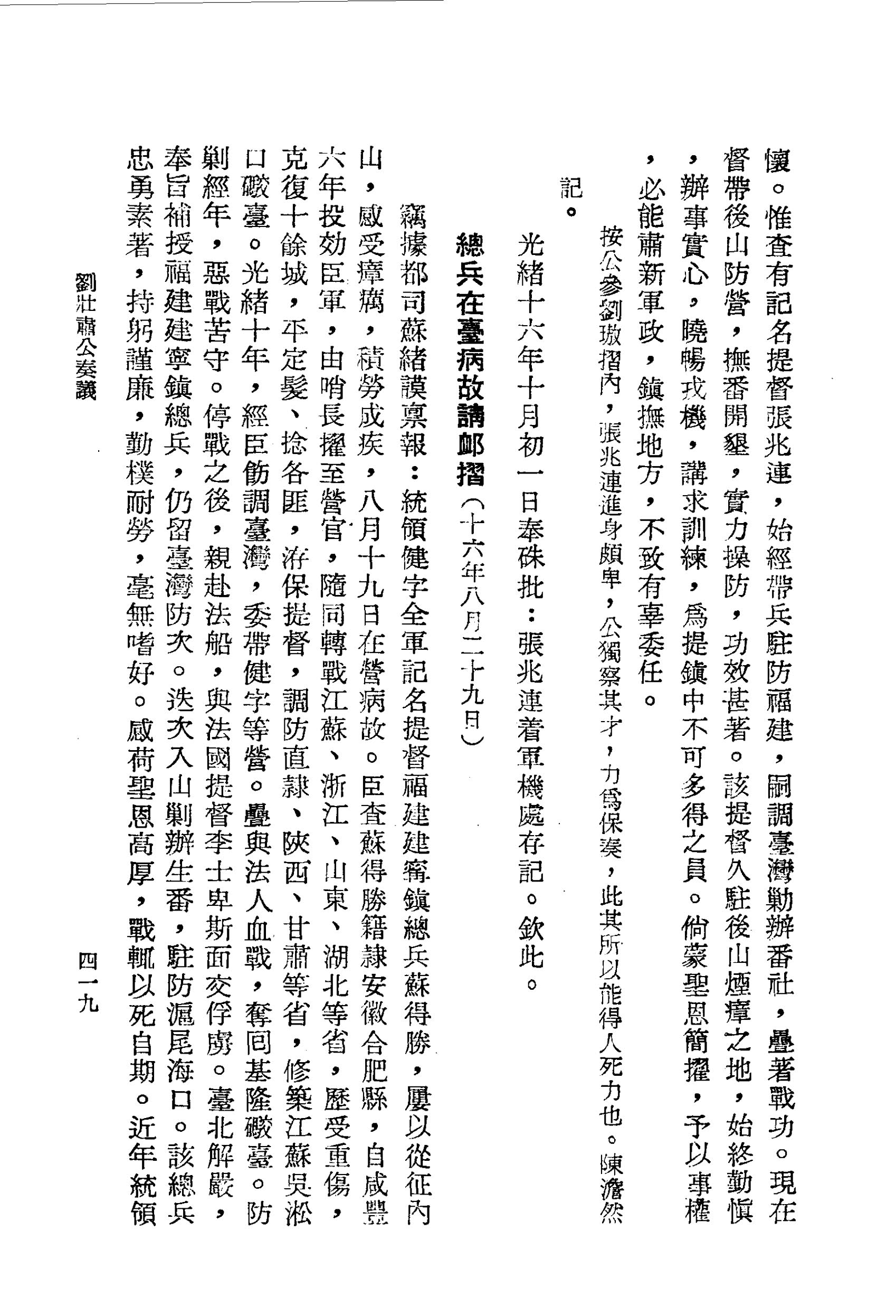 竊據都司蘇緒謨稟報:統領健字全軍記名提督福建建甯鎮總兵蘇得勝,屢以從征內山,感受瘴癘,積勞成疾,八月十九日在營病故。