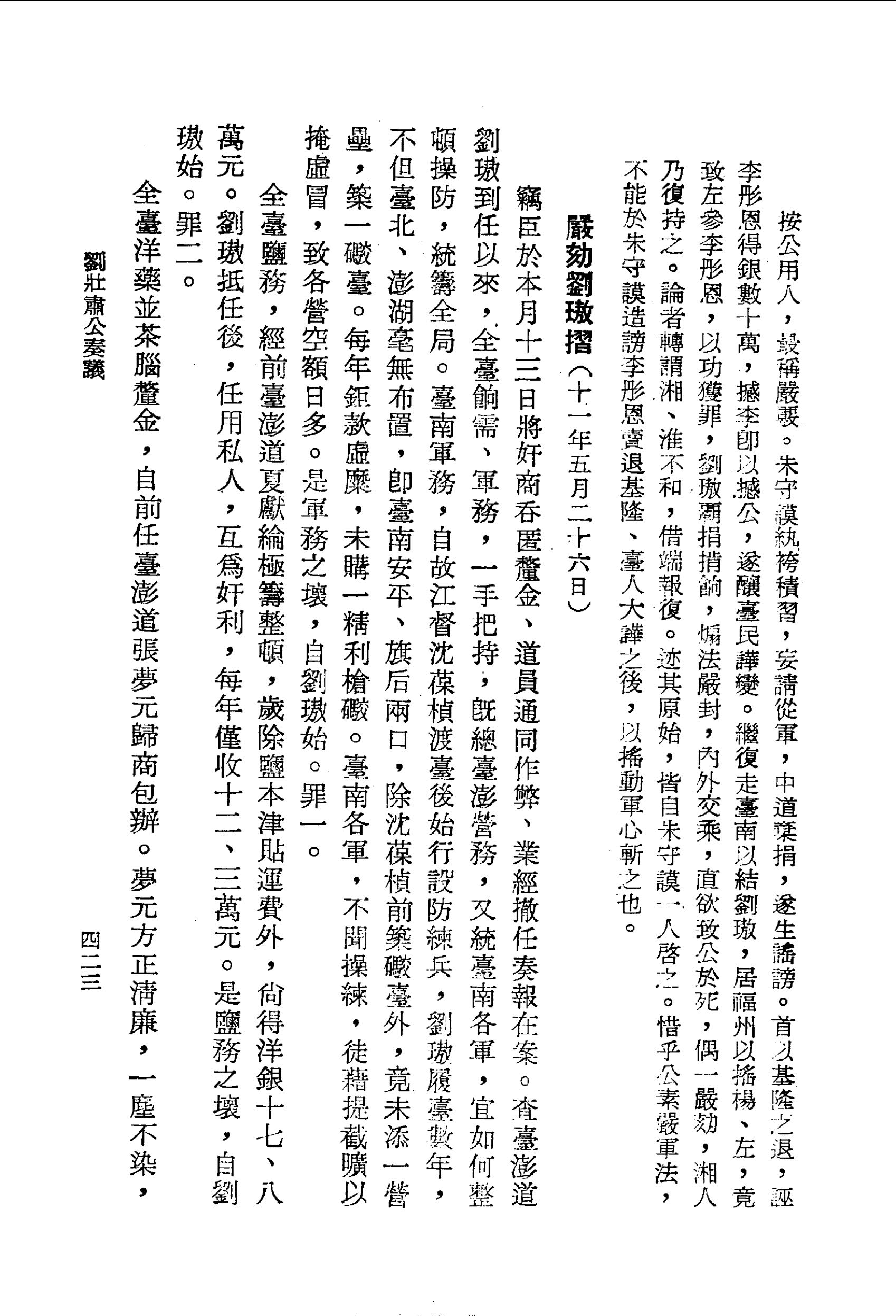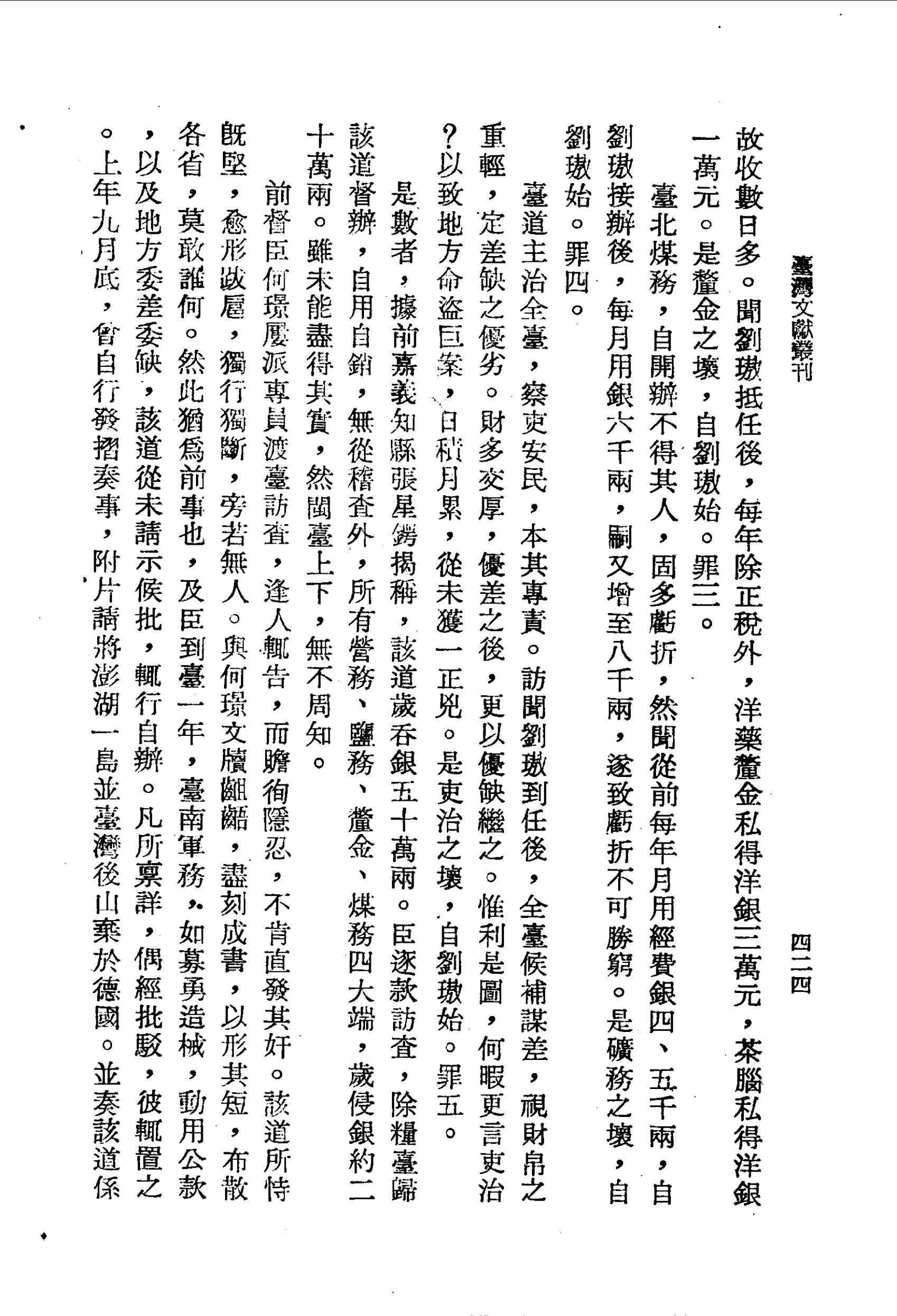 全臺洋藥並茶腦釐金,自前任臺澎道張夢元歸商包辦。夢元方正清廉,一塵不染,故收數日多。聞劉璈抵任後,每年除正稅外,洋藥釐金私得洋銀三萬元,茶腦私得洋銀一萬元。是釐金之壞,自劉璈始。