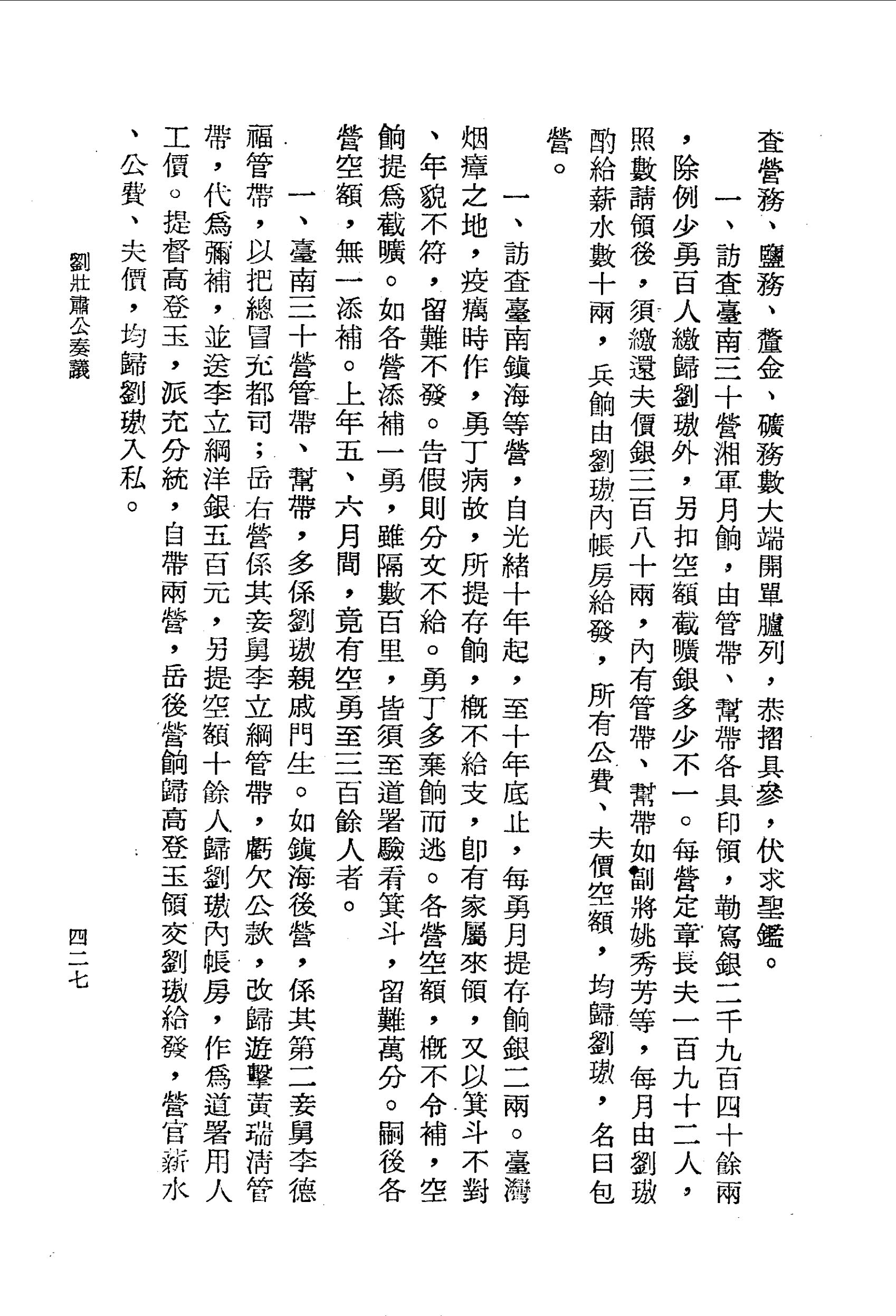 訪查臺南鎮海等營,自光緒十年起,至十年底止,每勇月提存餉銀二兩。臺灣烟瘴之地,疫癘時作,勇丁病故,所提存餉,概不給支,即有家屬來領,又以箕斗不對、年貌不符,留難不發。告假則分文不給。勇丁多棄餉而逃。各營空額,概不令補,空餉提為截曠。如各營添補一勇,雖隔數百里,皆須至道署驗看箕斗,留難萬分。嗣後各營空額,無一添補。上年五、六月間,竟有空勇至三百餘人者。