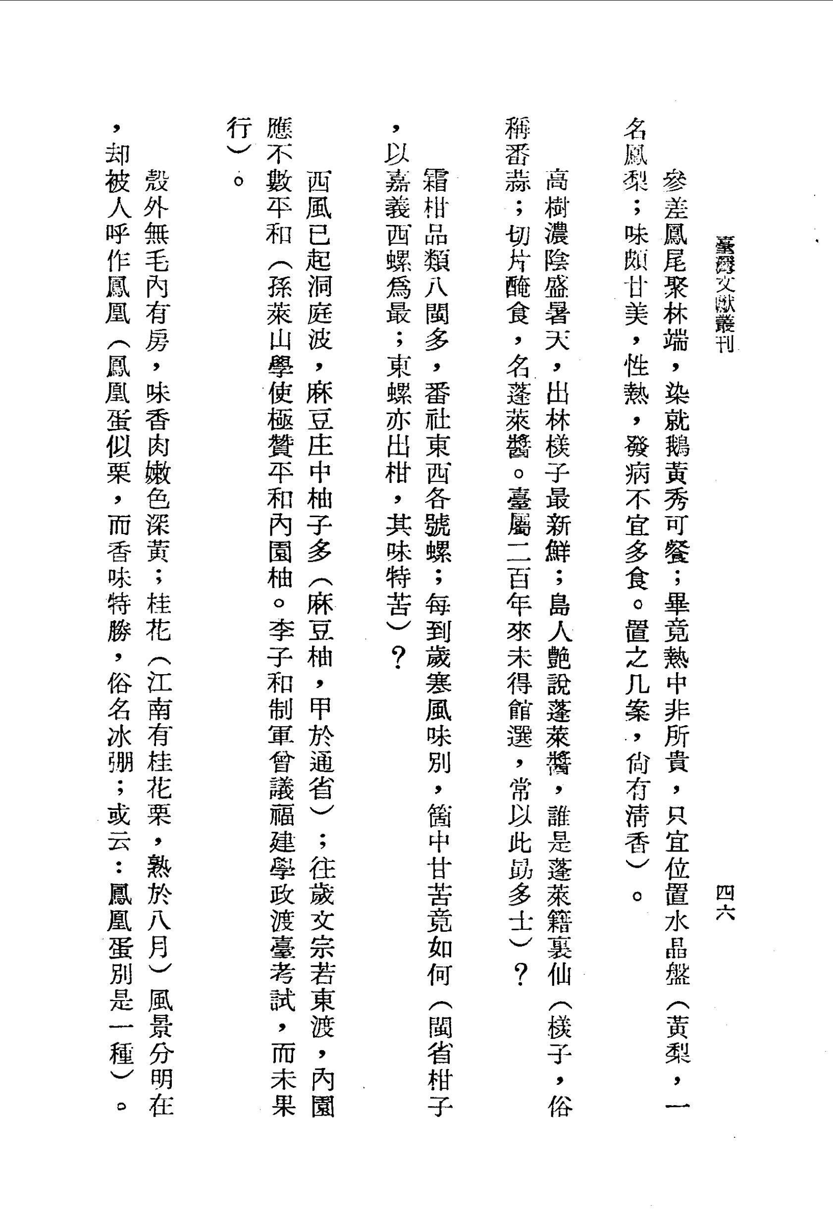 參差鳳尾聚林端,染就鵝黃秀可餐;畢竟熱中非所貴,只宜位置水晶盤(黃梨,一名鳳梨;味頗甘美,性熱,發病不宜多食。置之几案,尚有清香)。