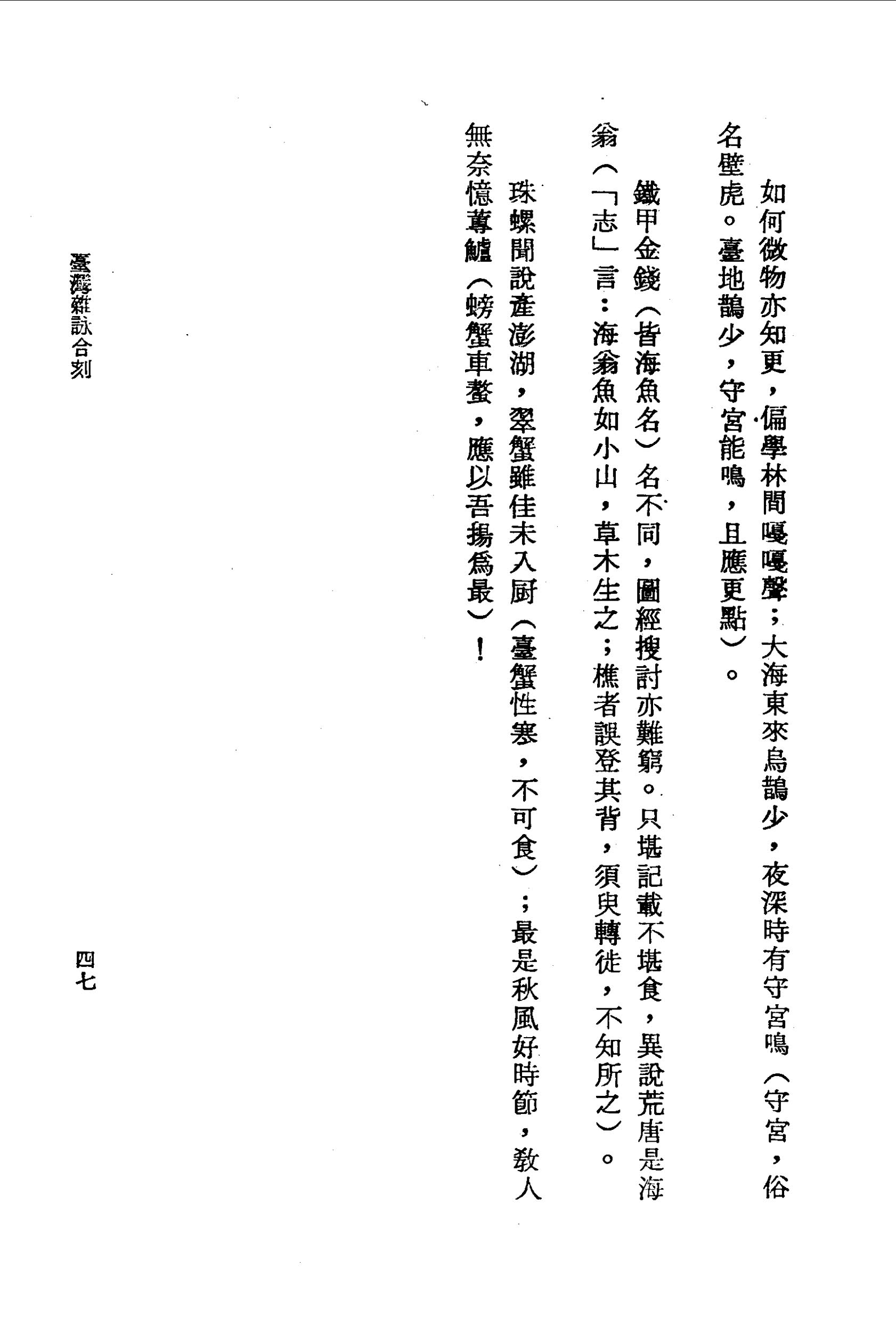 珠螺聞說產澎湖,翠蟹雖佳未入廚(臺蟹性寒,不可食);最是秋風好時節,教人無奈憶蓴鱸(螃蟹車螯,應以吾揚為最)!