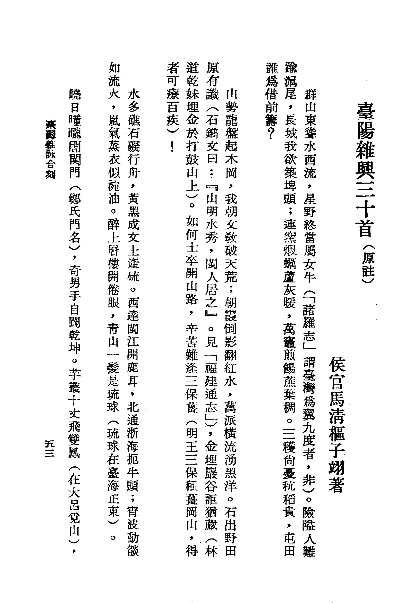 石出野田原有讖(石鐫文曰:『山明水秀,閩人居之』。見「福建通志」),金埋巖谷詎猶藏(林道乾妹埋金於打鼓山上)。 如何士卒開山路,辛苦難逢三保薑(明王三保種薑岡山,得者可療百疾)!