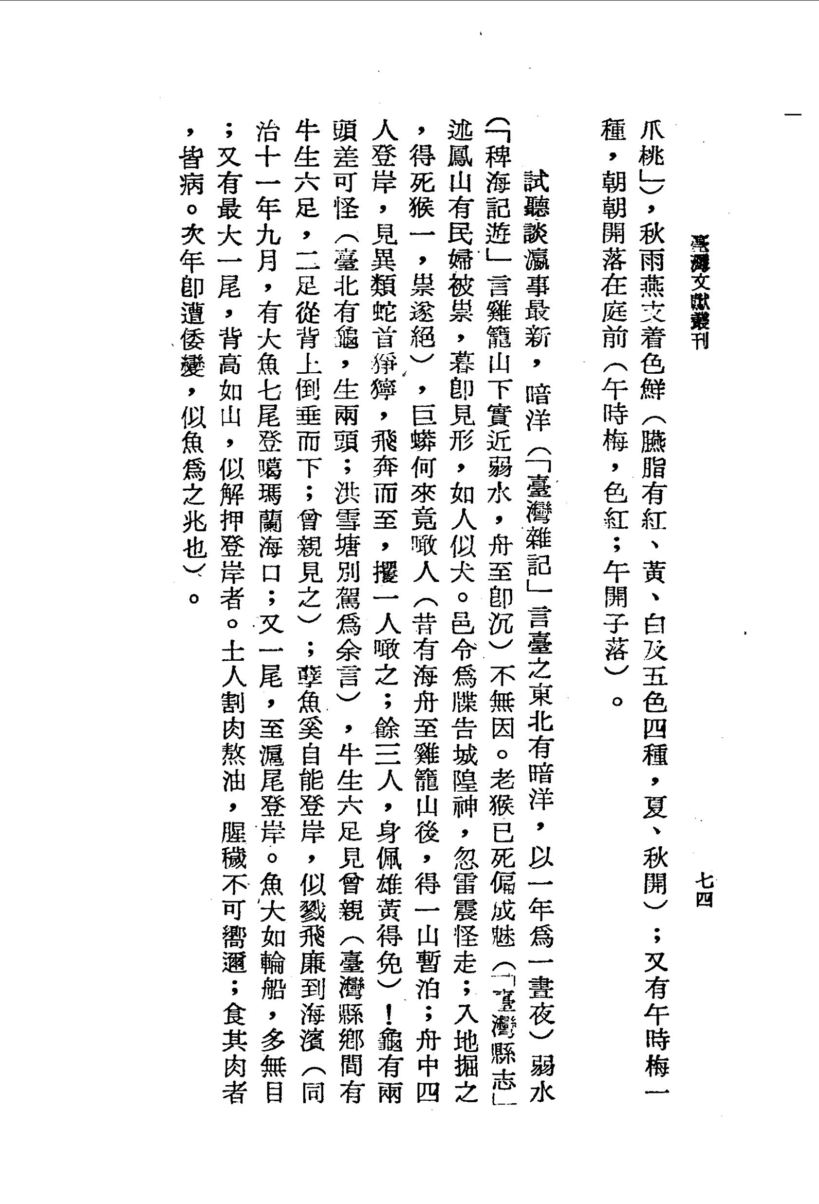 孽魚奚自能登岸,似戮飛廉到海濱。同治十一年九月,有大魚七尾登噶瑪蘭海口;又一尾,至滬尾登岸。魚大如輪船,多無目;又有最大一尾,背高如山,似解押登岸者。土人割肉熬油,腥穢不可嚮邇;食其肉者,皆病。次年即遭倭變,似魚為之兆也