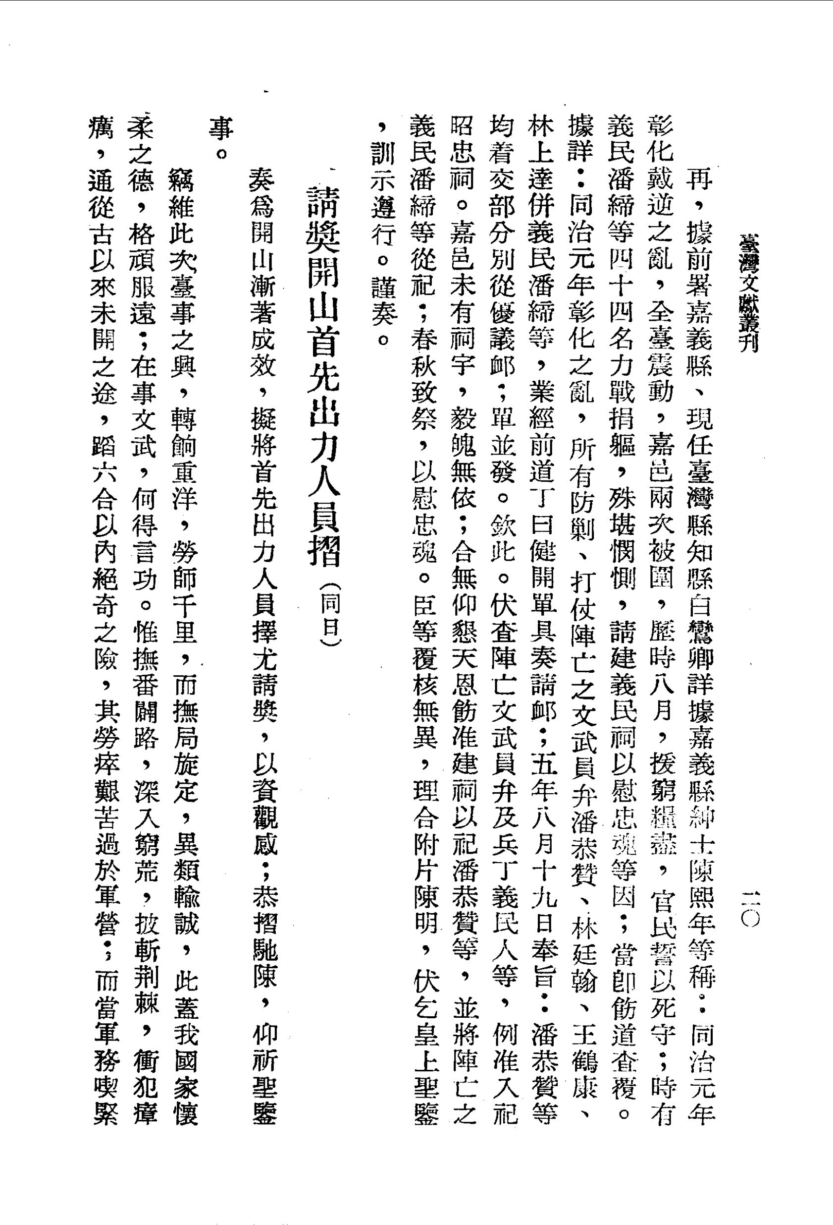 惟撫番闢路,深入窮荒,披斬荊棘,衝犯瘴癘,通從古以來未開之途,蹈六合以內絕奇之險,其勞瘁艱苦過於軍營;而當軍務喫緊之時,或深入刺探敵情、或孤軍鎮遏敵衝,或能聯絡民心,或能擒獲匪首,均屬著有微勞,未忍湮沒;非擇優請獎,無以鼓勵人心。