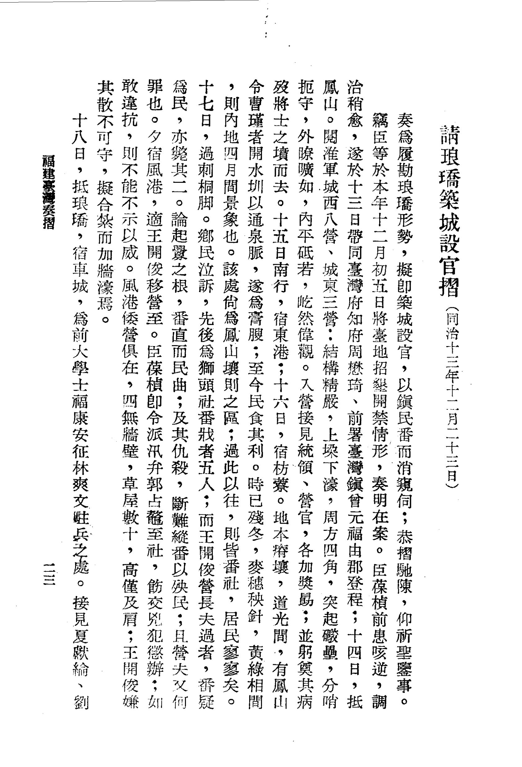 竊臣等於本年十二月初五日將臺地招墾開禁情形,奏明在案。 臣葆楨前患咳逆,調治稍愈,遂於十三日帶同臺灣府知府周懋琦、前署臺灣鎮曾元福由郡登程;十四日,抵鳳山。
