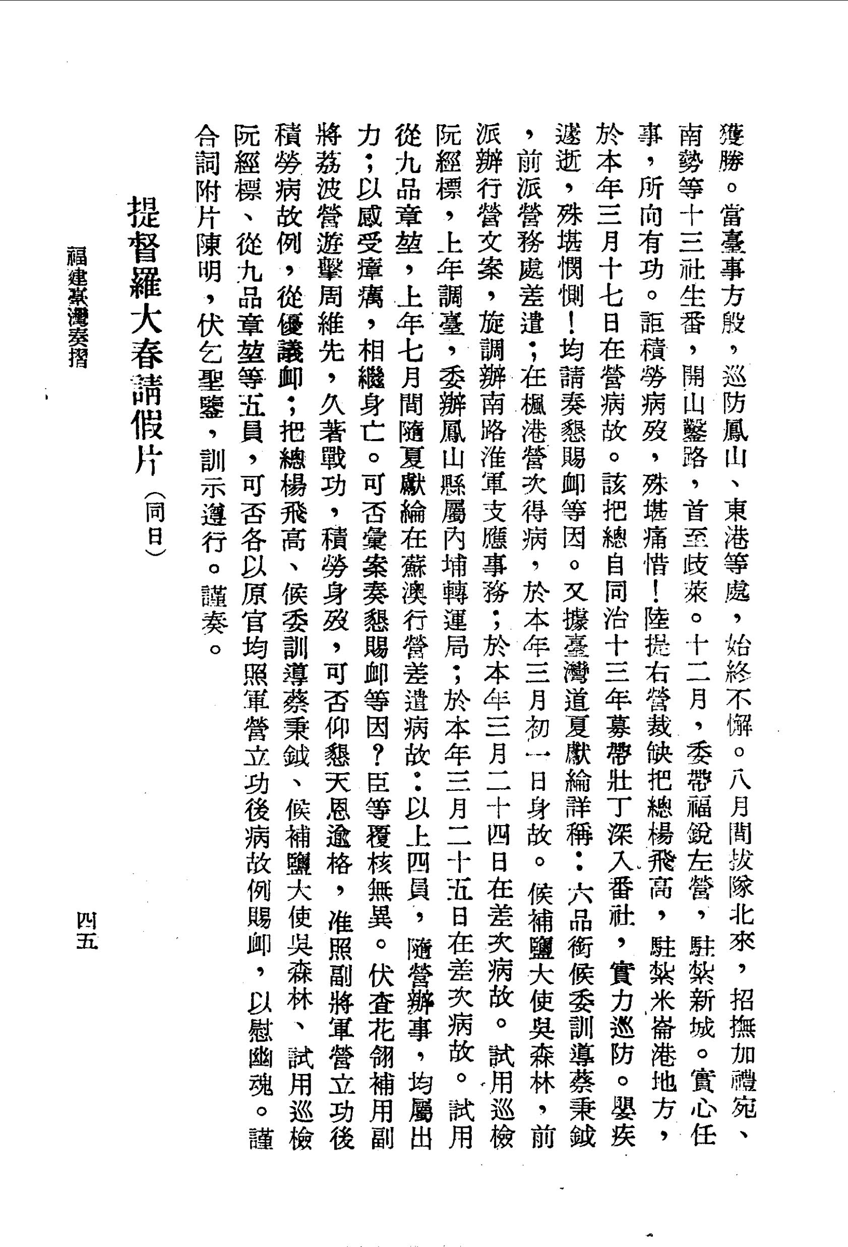 又據臺灣道夏獻綸詳稱:六品銜候委訓導蔡秉鉞,前派營務處差遣;在楓港營次得病,於本年三月初一日身故。候補鹽大使吳森林,前派辦行營文案,旋調辦南路淮軍支應事務;於本年三月二十四日在差次病故。試用巡檢阮經標,上年調臺,委辦鳳山縣屬內埔轉運局;於本年三月二十五日在差次病故。試用從九品章堃,上年七月間隨夏獻綸在蘇澳行營差遣病故:以上四員,隨營辦事,均屬出力;以感受瘴癘,相繼身亡。