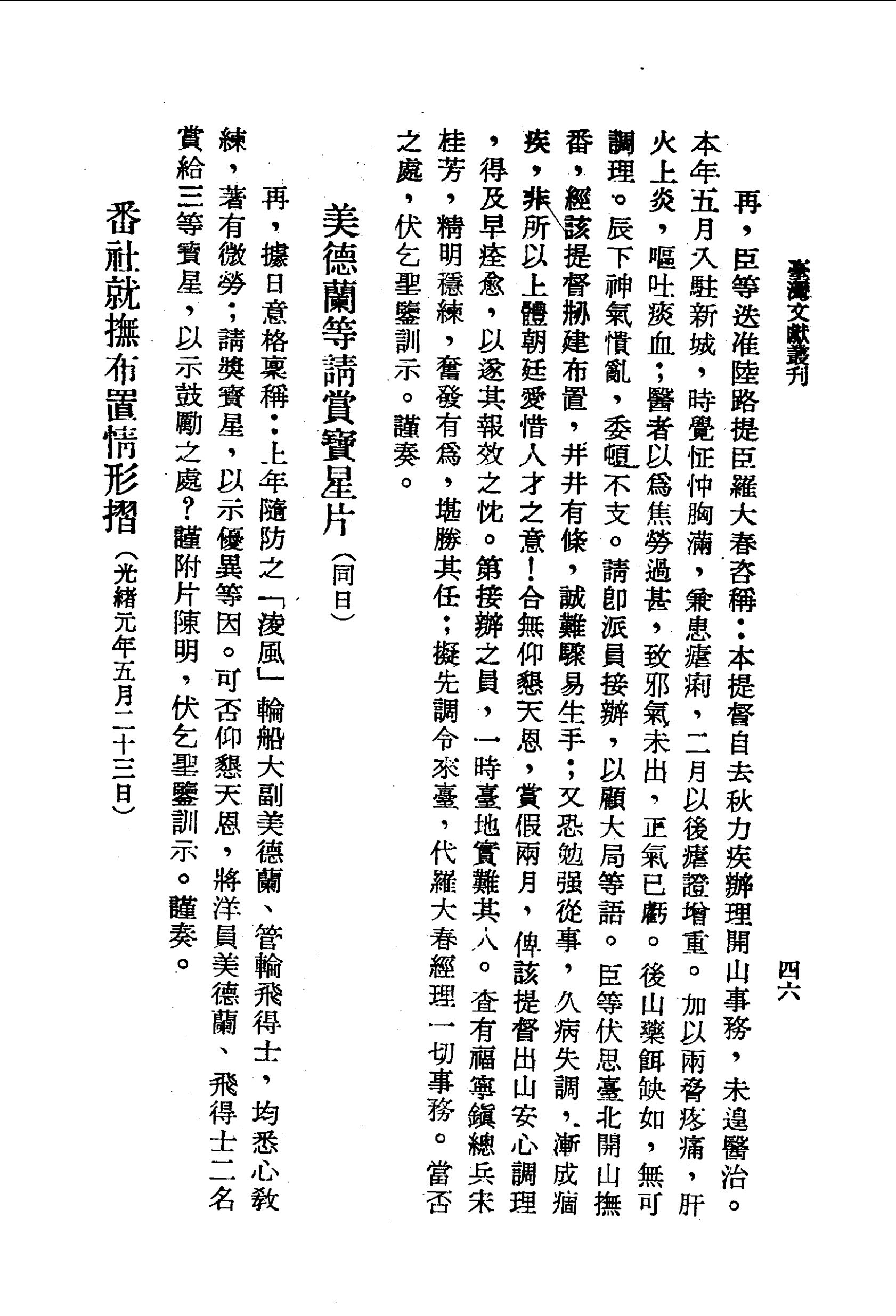 臣等迭准陸路提臣羅大春咨稱:本提督自去秋力疾辦理開山事務,未遑醫治。本年五月入駐新城,時覺怔忡胸滿,兼患瘧痢,二月以後瘧證增重。加以兩脅疼痛,肝火上炎,嘔吐痰血;醫者以為焦勞過甚,致邪氣未出,正氣已虧。後山藥餌缺如,無可調理。辰下神氣憒亂,委頓不支。請即派員接辦,以顧大局等語。臣等伏思臺北開山撫番,經該提督創建布置,井井有條,誠難驟易生手;又恐勉強從事,久病失調,漸成痼疾,非所以上體朝廷愛惜人才之意!合無仰懇天恩,賞假兩月,俾該提督出山安心調理,得及早痊愈,以遂其報效之忱。