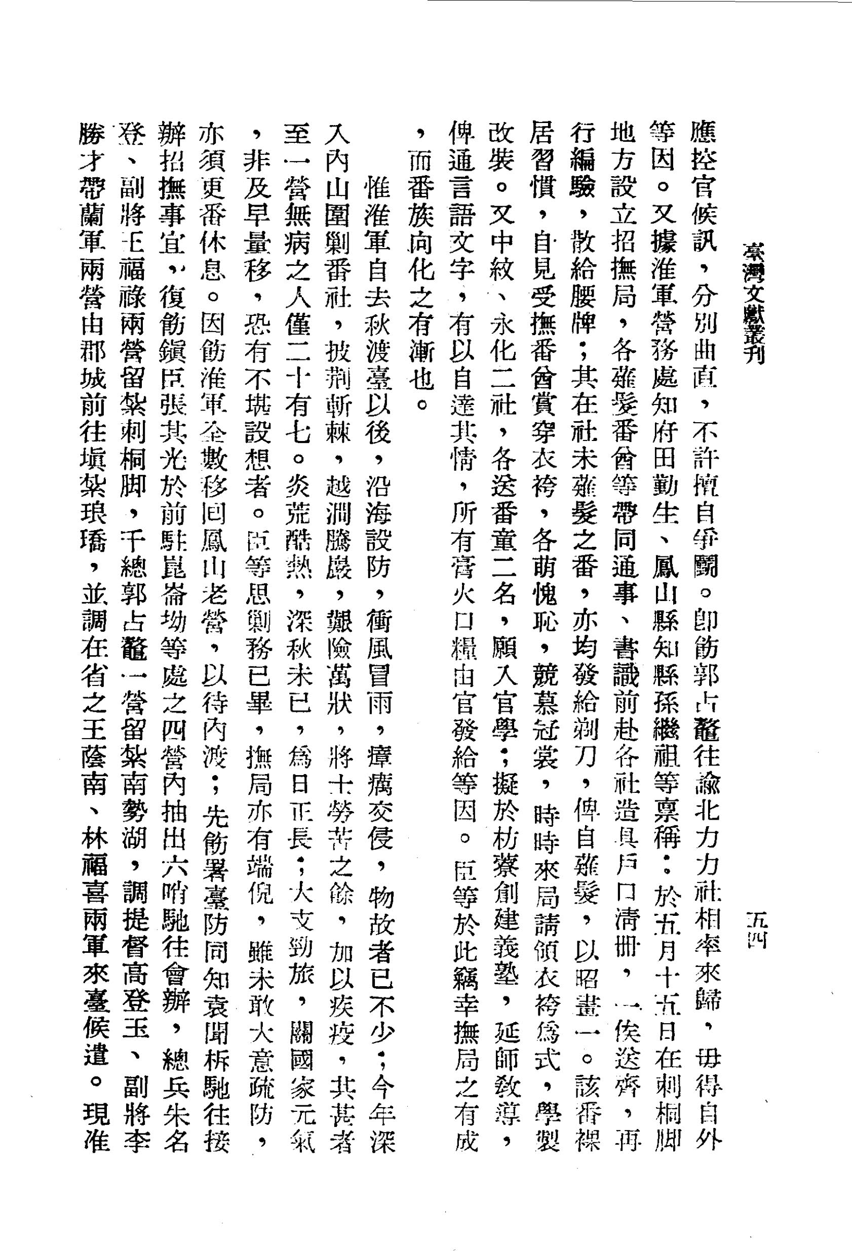 惟淮軍自去秋渡臺以後,沿海設防,衝風冒雨,瘴癘交侵,物故者已不少;今年深入內山圍勦番社,披荊斬棘,越澗騰巖,艱險萬狀,將士勞苦之餘,加以疾疫,其甚者至一營無病之人僅二十有七。炎荒酷熱,深秋未已,為日正長;大支勁旅,關國家元氣,非及早量移,恐有不堪設想者。臣等思勦務已畢,撫局亦有端倪,雖未敢大意疏防,亦須更番休息。