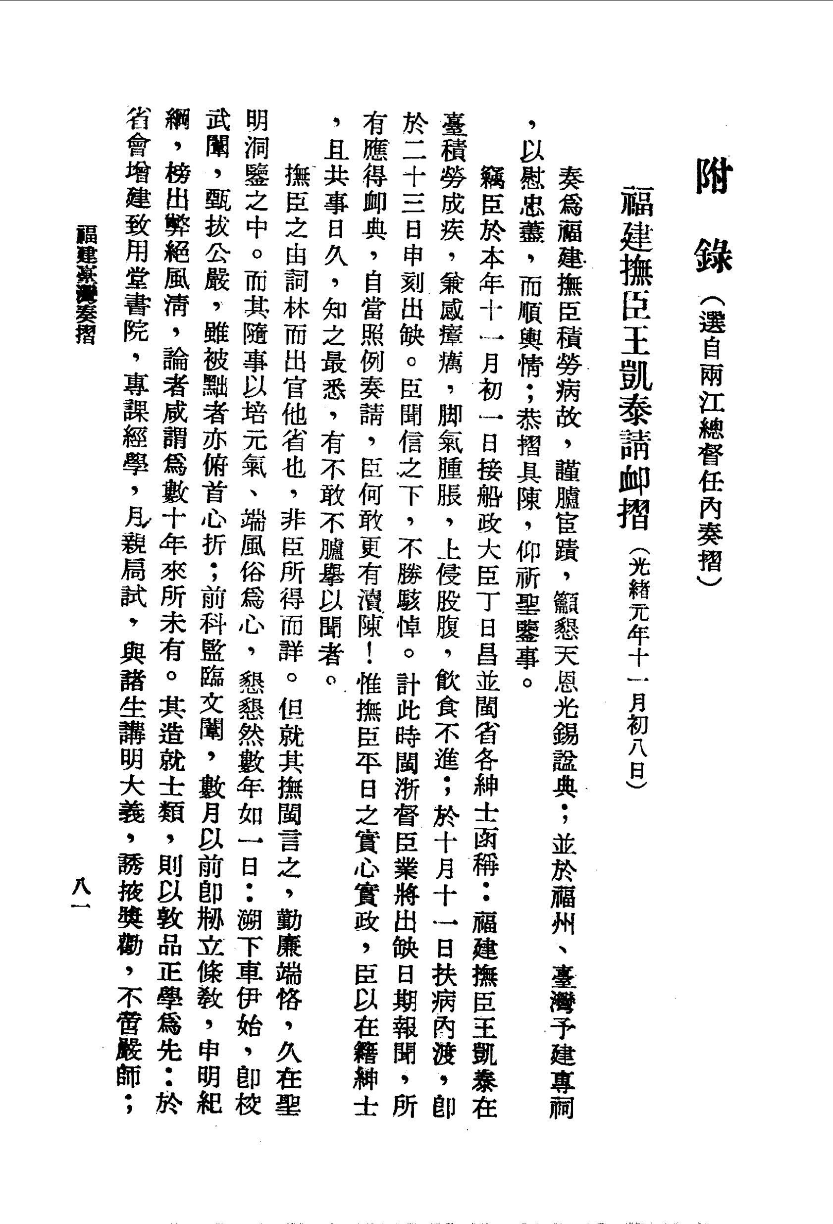竊臣於本年十一月初一日接船政大臣丁日昌並閩省各紳士函稱:福建撫臣王凱泰在臺積勞成疾,兼感瘴癘,腳氣腫脹,上侵股腹,飲食不進;於十月十一日扶病內渡,即於二十三日申刻出缺。