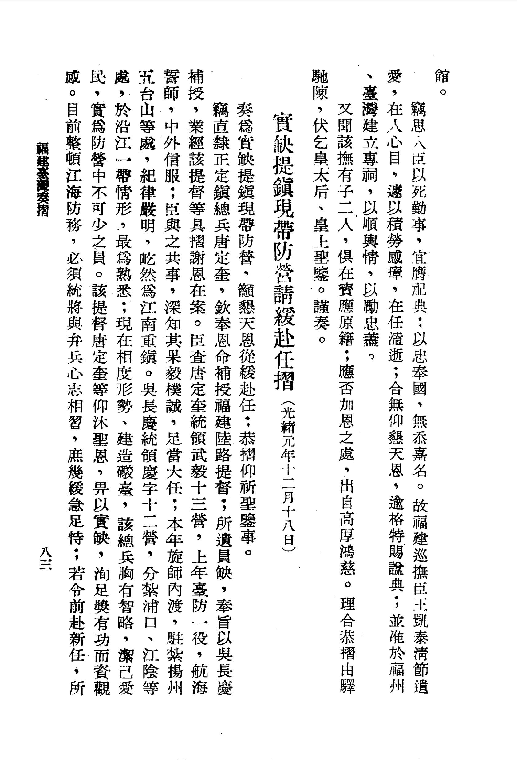 竊思人臣以死勤事,宜膺祀典:以忠奉國,無忝嘉名。故福建巡撫臣王凱泰清節遺愛,在人心目,遽以積勞感瘴,在任溘逝;合無仰懇天恩,逾格特賜諡典;並准於福州、臺灣建立專祠,以順輿情,以勵忠藎。