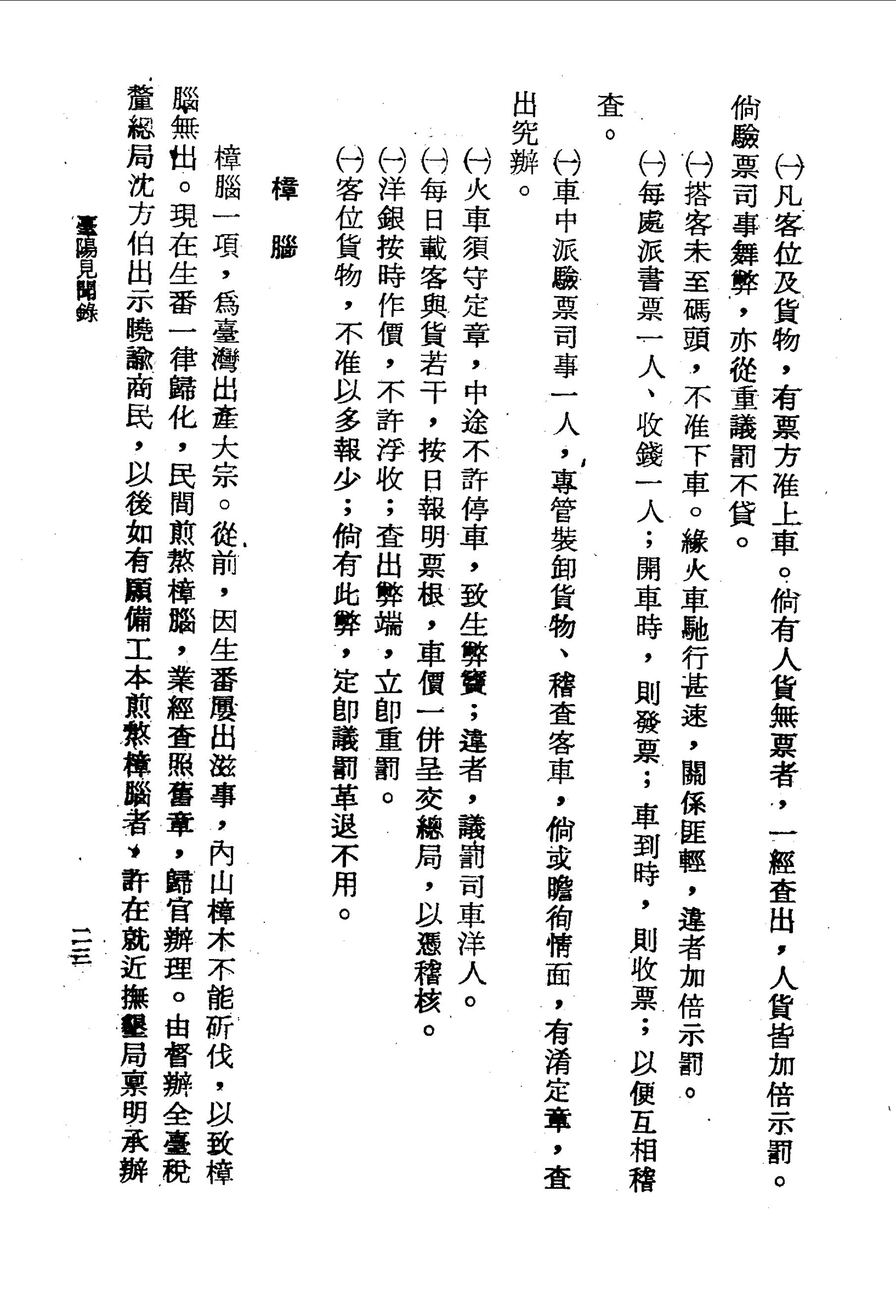 樟腦一項,為臺灣出產大宗。從前,因生番屢出滋事,內山樟木不能斫伐,以致樟腦無出。現在生番一律歸化,民間煎熬樟腦,業經查照舊章,歸官辦理。由督辦全臺稅釐總局沈方伯出示曉諭商民,以後如有願備工本煎熬樟腦者,許在就近撫墾局稟明承辦。俟煎成之日,歸官定價收買,不准走漏。第此物全視人工之多寡;人工易得,煮熬可多。現在內山生番歸化,土人爭墾荒地,其利倍於熬腦。