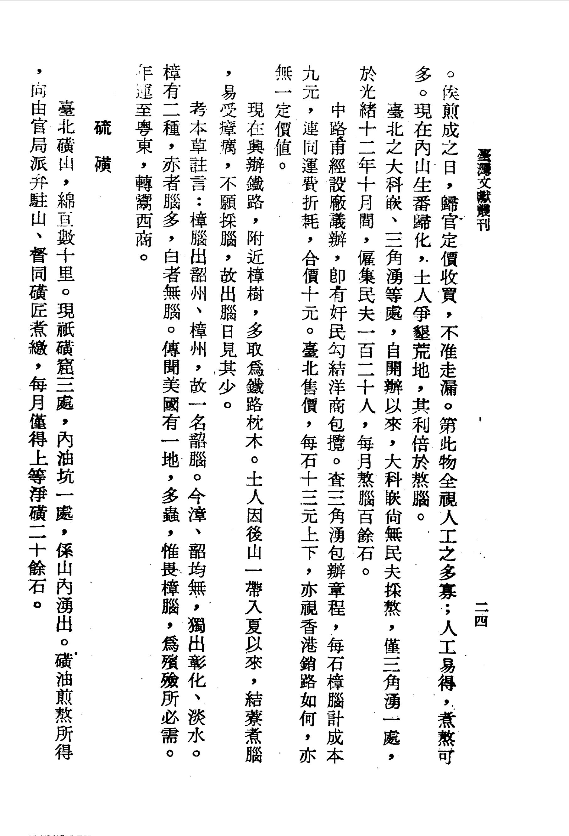 中路甫經設廠議辦,即有奸民勾結洋商包攬。查三角湧包辦章程,每石樟腦計成本九元,連同運費折耗,合價十元。臺北售價,每石十三元上下,亦視香港銷路如何,亦無一定價值。