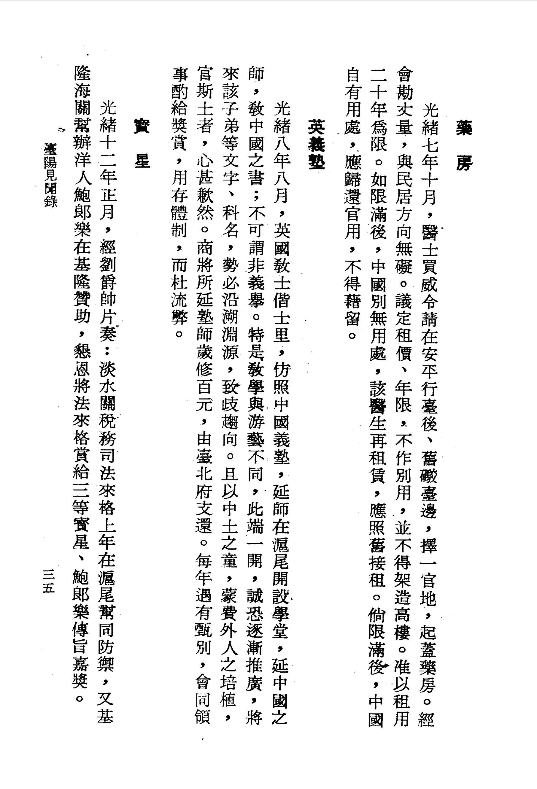 光緒七年十月,醫士買威令請在安平行臺後、舊礮臺邊,擇一官地,起蓋藥房。經會勘丈量,與民居方向無礙。議定租價、年限,不作別用,並不得架造高樓。准以租用二十年為限。如限滿後,中國別無用處,該醫生再租賃,應照舊接租。倘限滿後,中國自有用處,應歸還官用,不得藉留。