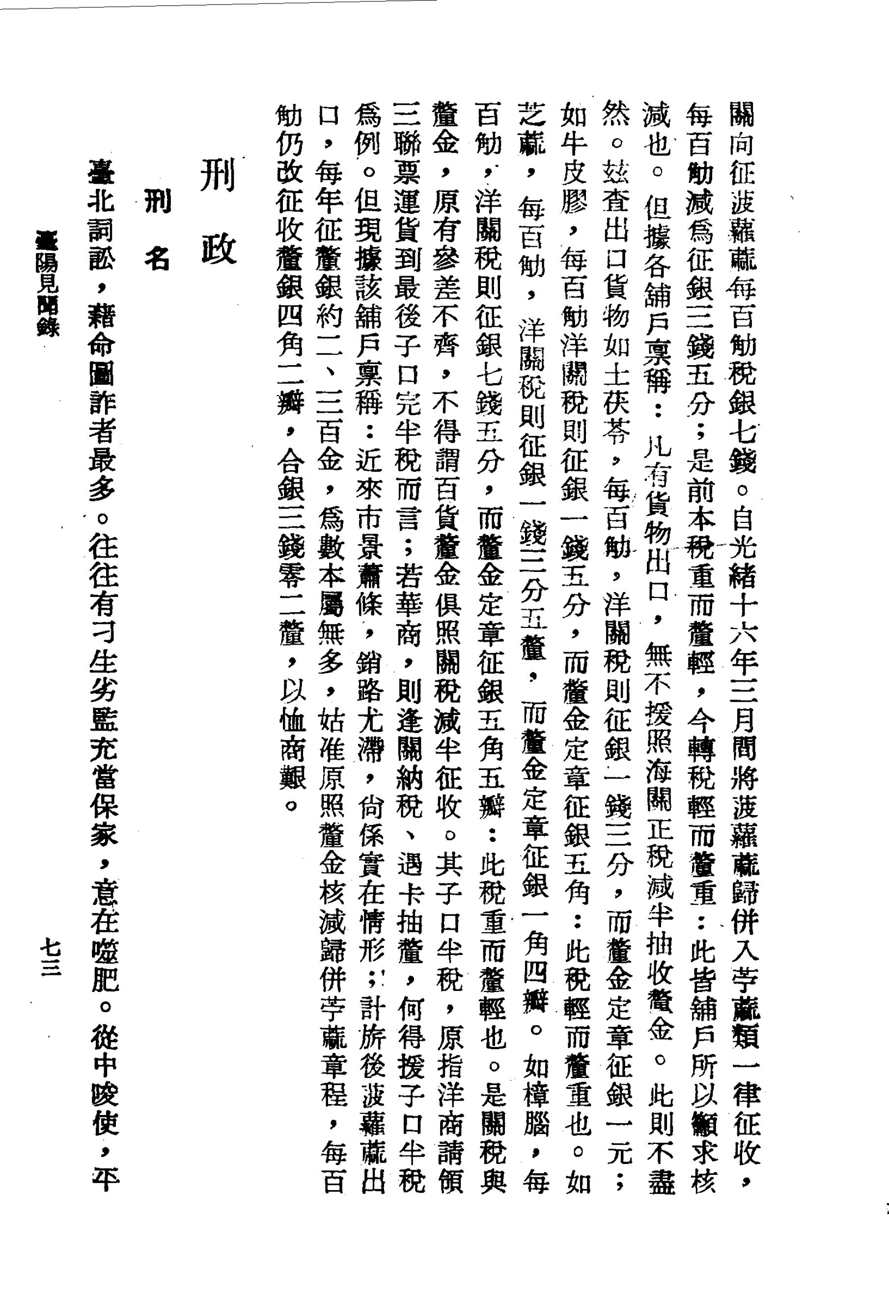 如樟腦,每百觔,洋關稅則征銀七錢五分,而釐金定章征銀五角五瓣:此稅重而釐輕也。
