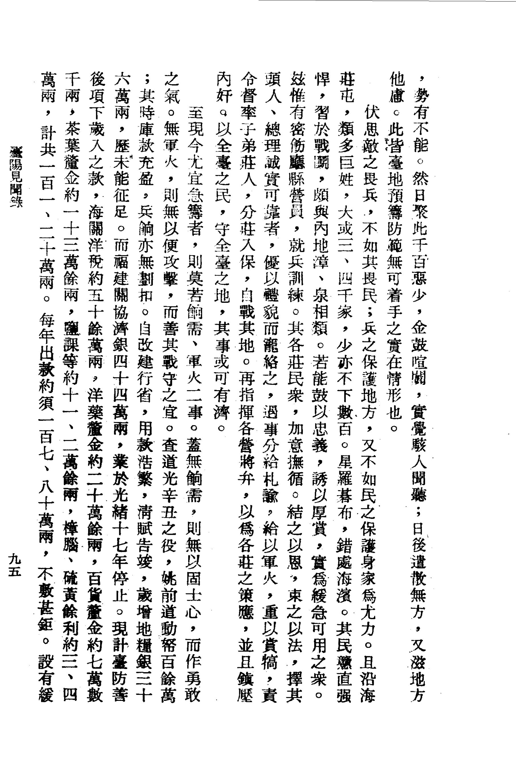 現計臺防善後項下歲入之款,海關洋稅約五十餘萬兩,洋藥釐金約二十萬餘兩,百貨釐金約七萬數千兩,茶葉釐金約一十三萬餘兩,鹽課等約十一、二萬餘兩,樟腦、硫黃餘利約三、四萬兩,計共一百一、二十萬兩。