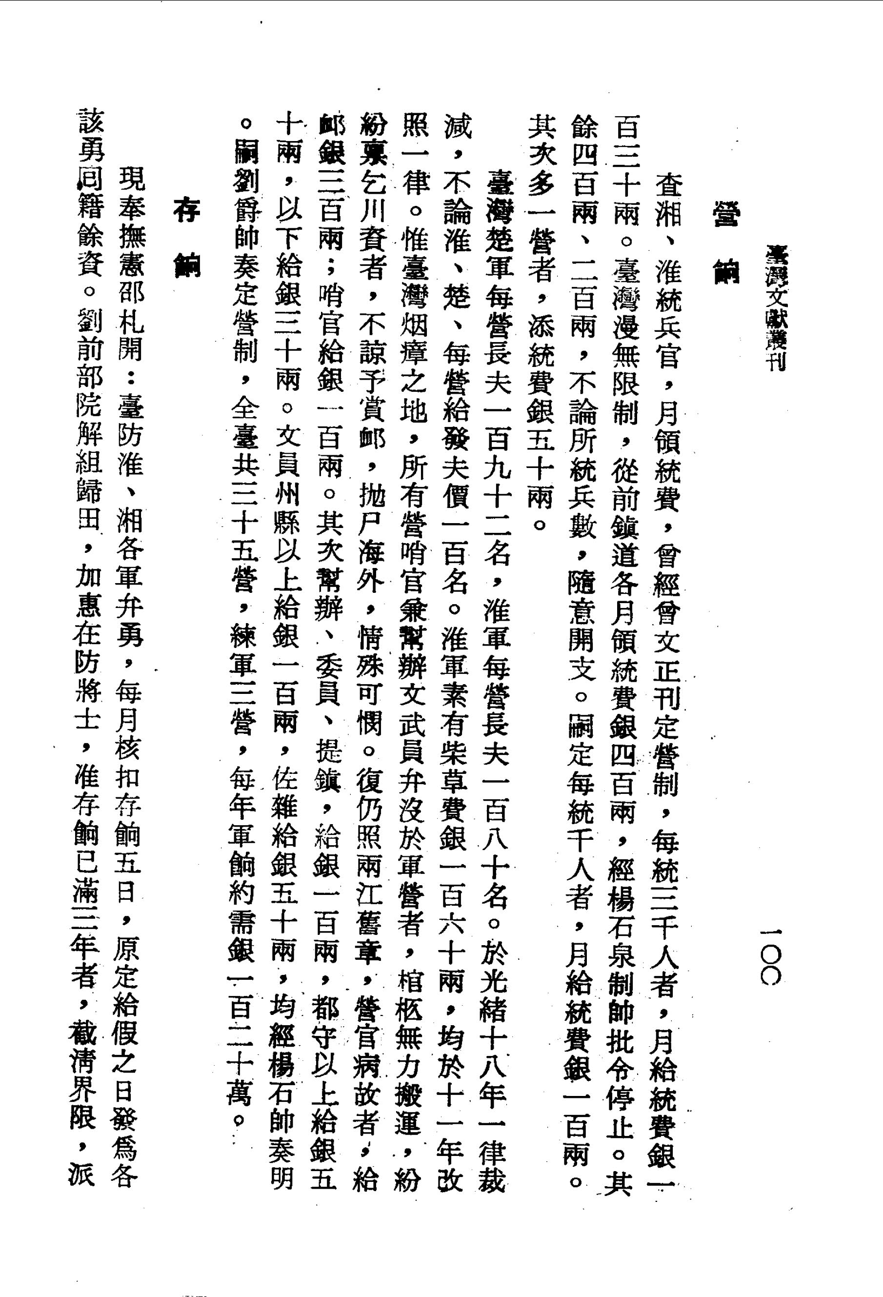 惟臺灣煙瘴之地,所有營哨官兼幫辦文武員弁沒於軍營者,棺柩無力搬運,紛紛稟乞川資者,不諒予賞卹,拋尸海外,情殊可憫。復仍照兩江舊章,營官病故者,給卹銀三百兩;哨官給銀一百兩。