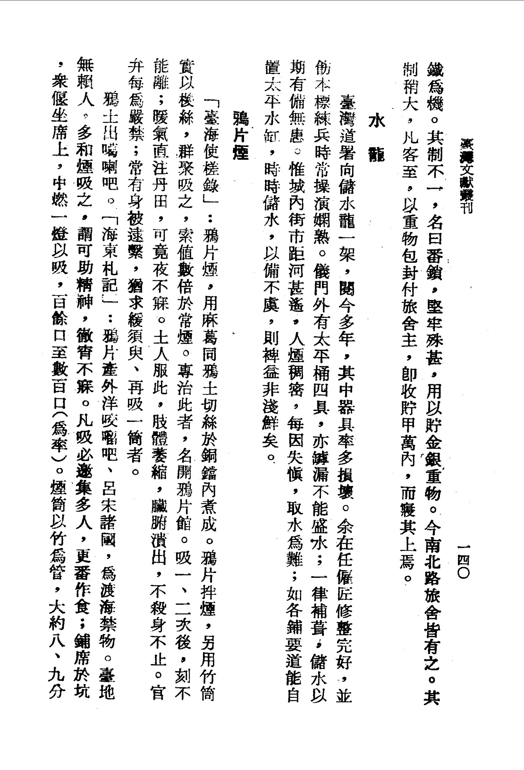 「臺海使槎錄」:鴉片煙,用麻葛同鴉土切絲於銅鐺內煮成。鴉片拌煙,另用竹筒實以椶絲,群聚吸之,索值數倍於常煙。專治此者,名開鴉片館。吸一、二次後,刻不能離;暖氣直注丹田,可竟夜不寐。土人服此,肢體萎縮,臟腑潰出,不殺身不止。官弁每為嚴禁;常有身被逮繫,猶求緩須臾、再吸一筒者。