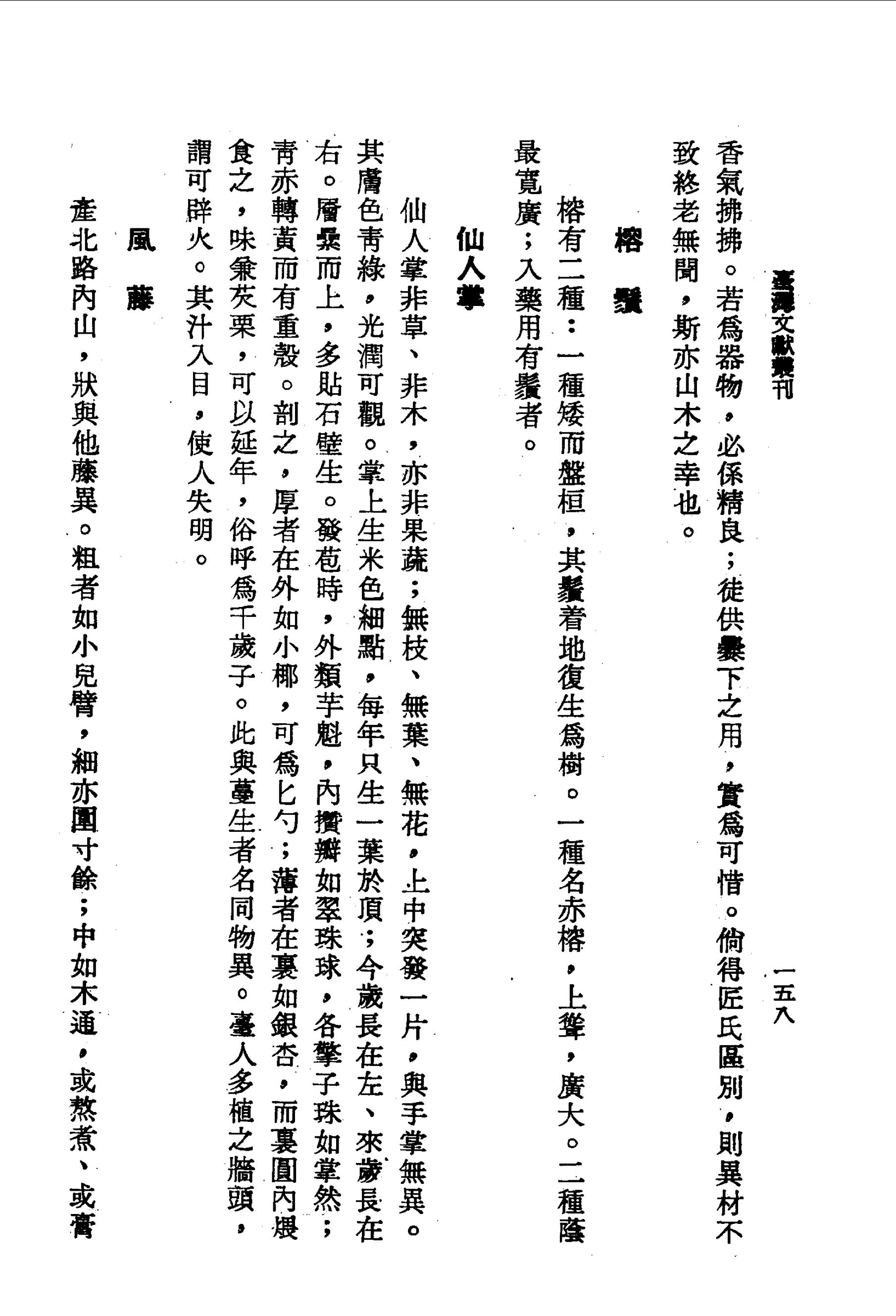 仙人掌非草、非木,亦非果蔬;無枝、無葉、無花,上中突發一片,與手掌無異。其膚色青綠,光潤可觀。掌上生米色細點,每年只生一葉於頂;今歲長在左、來歲長在右。層纍而上,多貼石壁生。發苞時,外類芋魁,內攢瓣如翠珠球,各擎子珠如掌然;青赤轉黃而有重殼。剖之,厚者在外如小椰,可為匕勺;薄者在裏如銀杏,而裏圓內煨食之,味兼芡栗,可以延年,俗呼為千歲子。此與蔓生者名同物異。臺人多植之牆頭,謂可辟火。 其汁入目,使人失明。