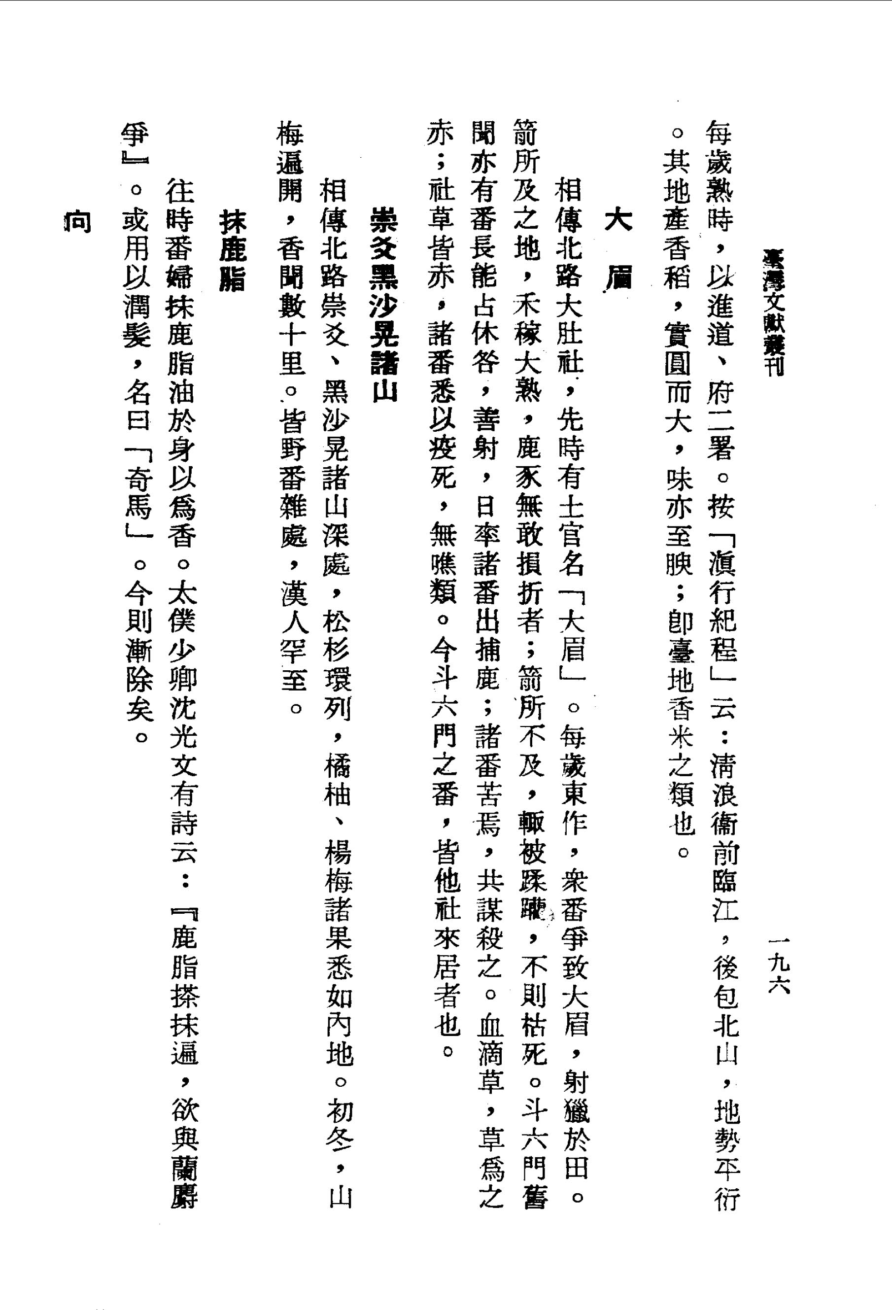相傳北路大肚社,先時有土官名「大眉」。每歲東作,眾番爭致大眉,射獵於田。箭所及之地,禾稼大熟,鹿豕無敢損折者;箭所不及,輒被蹂躪,不則枯死。斗六門舊聞亦有番長能占休咎,善射,日率諸番出捕鹿;諸番苦焉,共謀殺之。血滴草,草為之赤;社草皆赤,諸番悉以疫死,無噍類。今斗六門之番,皆他社來居者也。