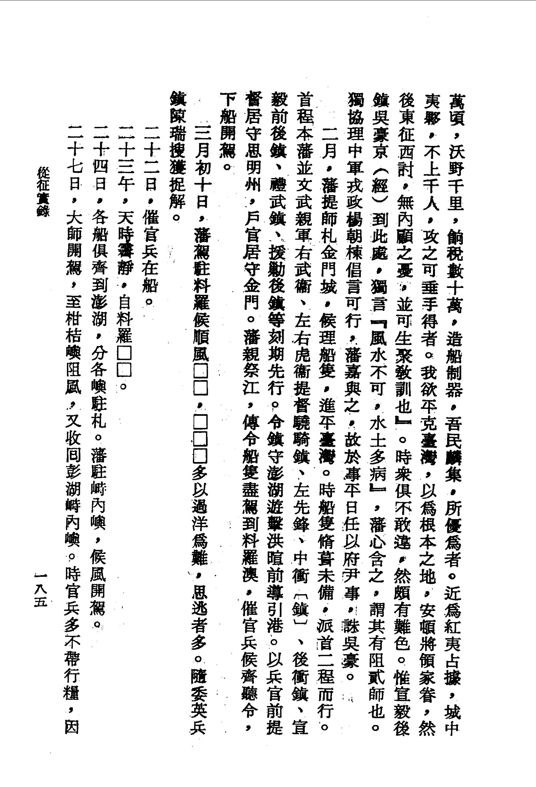 近為紅夷占據,城中夷夥,不上千人,攻之可垂手得者。我欲平克臺灣,以為根本之地,安頓將領家眷,然後東征西討,無內顧之憂,並可生聚教訓也』。時眾俱不敢違,然頗有難色。 惟宣毅後鎮吳豪京(經)到此處,獨言『風水不可,水土多病』,藩心含之,謂其有阻貳師也。獨協理中軍戎政楊朝棟倡言可行,藩嘉與之,故於事平日任以府尹事,誅吳豪。