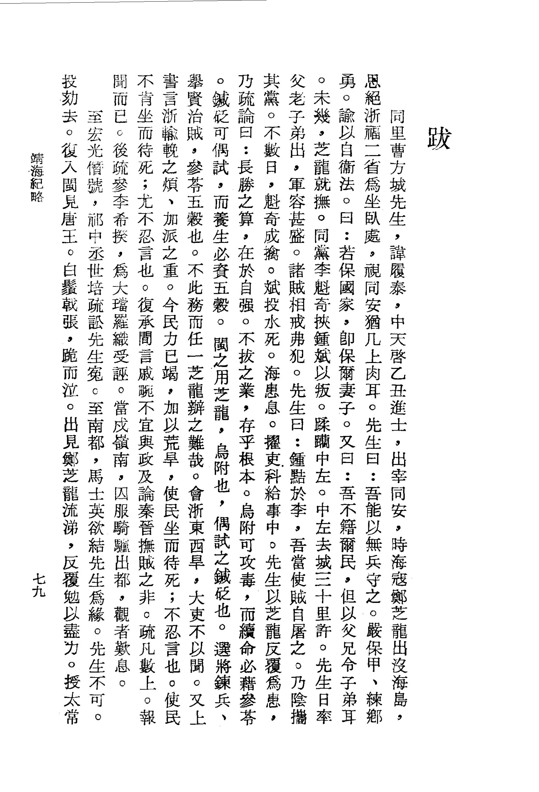 先生以芝龍反覆為患,乃疏論曰:長勝之算,在於自強。不拔之業,存乎根本。烏附可攻毒,而續命必藉參苓。鍼砭可偶試,而養生必資五穀。閩之用芝龍,烏附也,偶試之鍼砭也。選將鍊兵、舉賢治賊,參苓五穀也。不此務而任一芝龍辦之難哉。