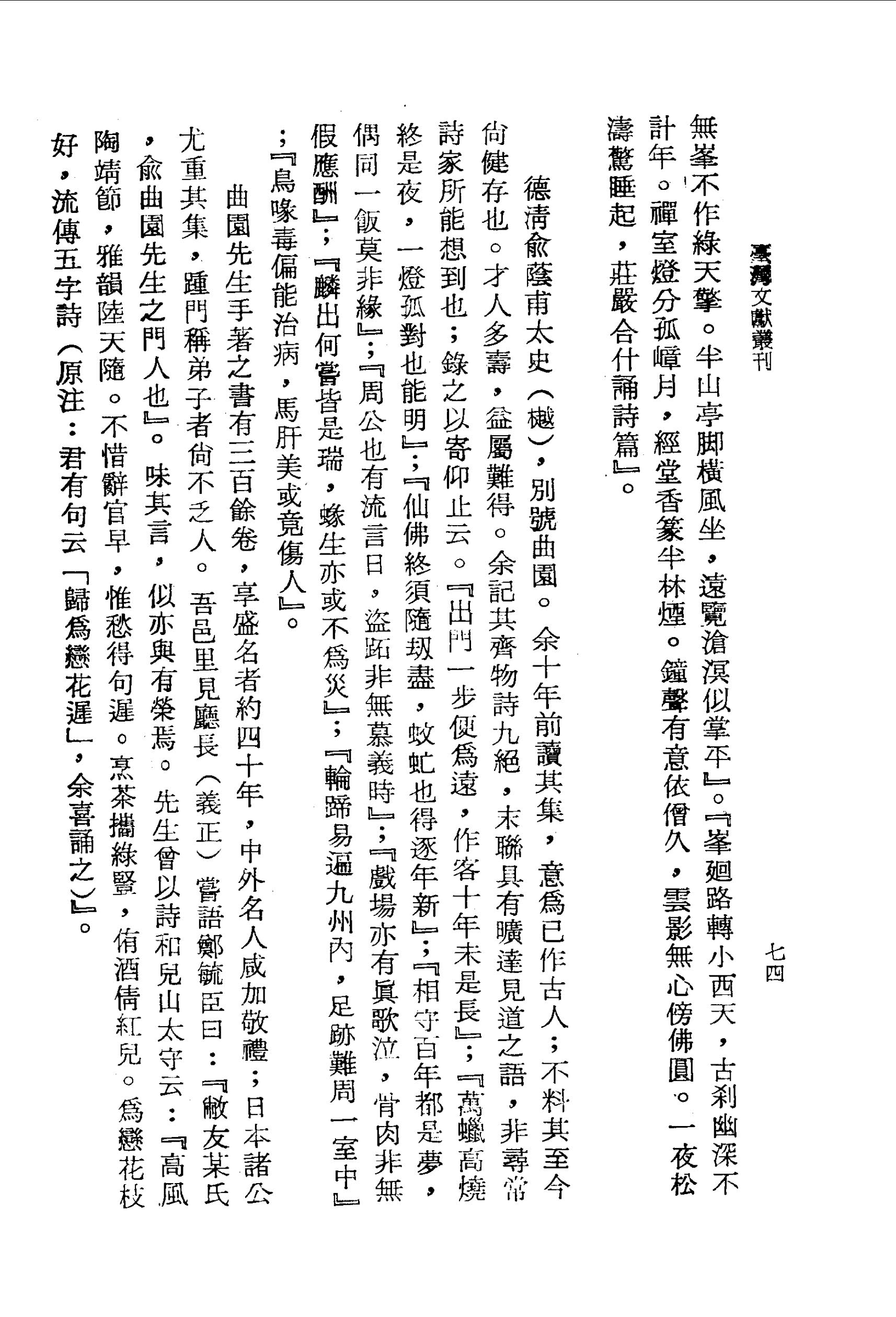 余記其齊物詩九絕,末聯具有曠達見道之語,非尋常詩家所能想到也;錄之以寄仰止云。『出門一步便為遠,作客十年未是長』;『萬蠟高燒終是夜,一燈孤對也能明』;『仙佛終須隨劫盡,蚊虻也得逐年新』;『相守百年都是夢,偶同一飯莫非緣』;『周公也有流言日,盜跖非無慕義時』;『戲場亦有真歌泣,骨肉非無假應酬』;『麟出何嘗皆是瑞,蝝生亦或不為災』;『輪蹄易遍九州內,足跡難周一室中』; 『鳥喙毒偏能治病,馬肝美或竟傷人』。