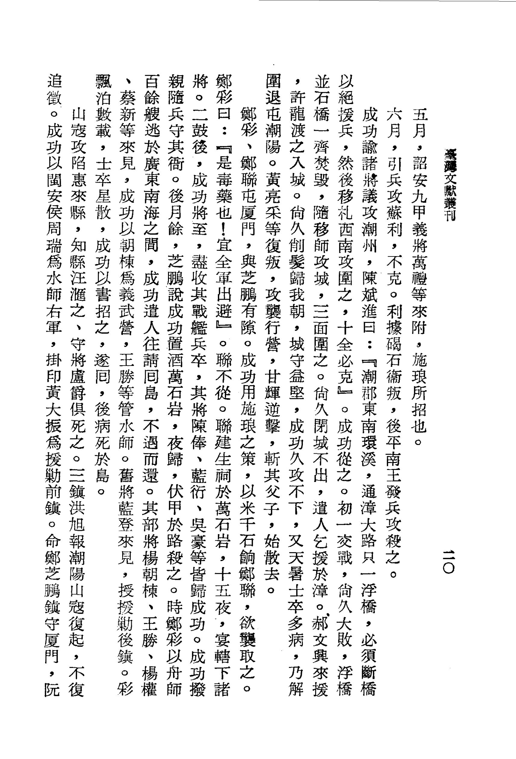 成功諭諸將議攻潮州,陳斌進曰:『潮郡東南環溪,通漳大路只一浮橋,必須斷橋以絕援兵,然後移札西南攻圍之,十全必克』。成功從之。初一交戰,尚久大敗,浮橋並石橋一齊焚毀,隨移師攻城,三面圍之。尚久閉城不出,遣人乞援於漳。郝文興來援,許龍渡之入城。尚久削髮歸我朝,城守益堅,成功久攻不下,又天暑士卒多病,乃解圍退屯潮陽。黃亮采等復叛,攻襲行營,甘輝逆擊,斬其父子,始散去。