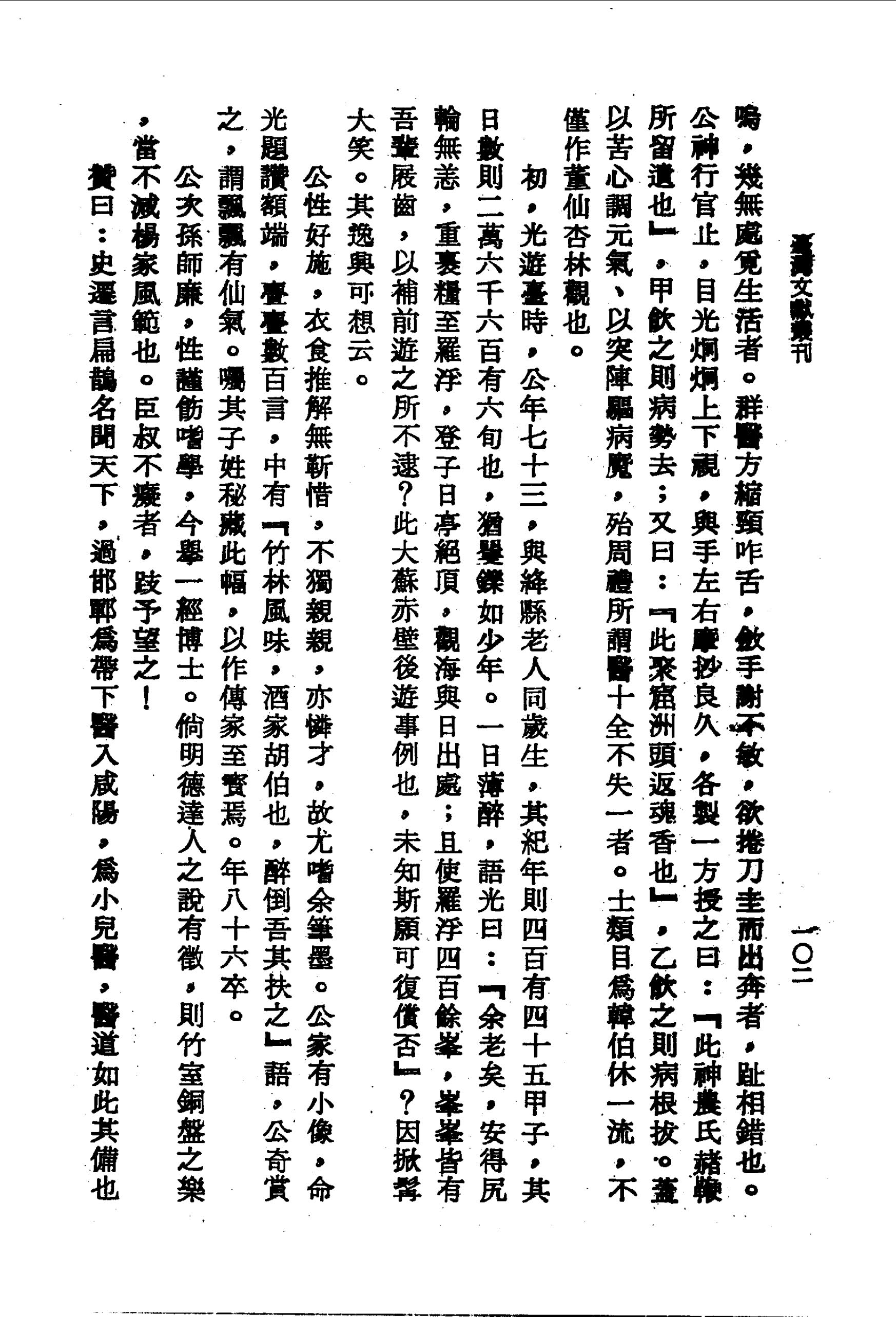 就中惟痘疹一科,於生死關頭尤鉅。按痘疹不見史冊,獨文苑英華載陳黯痘花詩一首云。今毒流海內幾徧。公精於痘疹科,聞有禮請者,無近遠貧富,不俟輿輒往。至則男女壯穉,坐者、臥者、呻吟者,一家哭聲嗚嗚,幾無處覓生活者。群醫方縮頸咋舌,斂手謝不敏,欲捲刀圭而出奔者,趾相錯也。公神行官止,目光炯炯上下視,與手左右摩挱良久,各製一方授之曰:『此神農氏赭鞭所留遺也』,甲飲之則病勢去;又曰:『此聚窟洲頭返魂香也』,乙飲之則病根拔。蓋以苦心調元氣、以突陣驅病魔,殆周禮所謂醫十全不失一者。