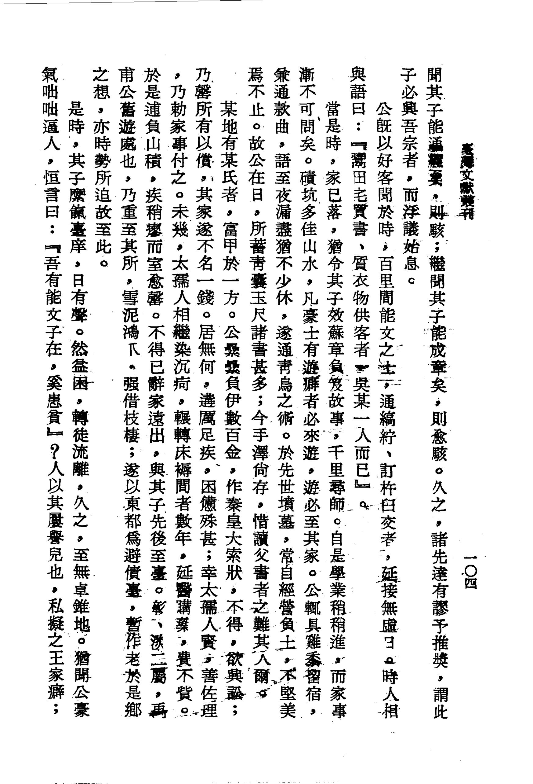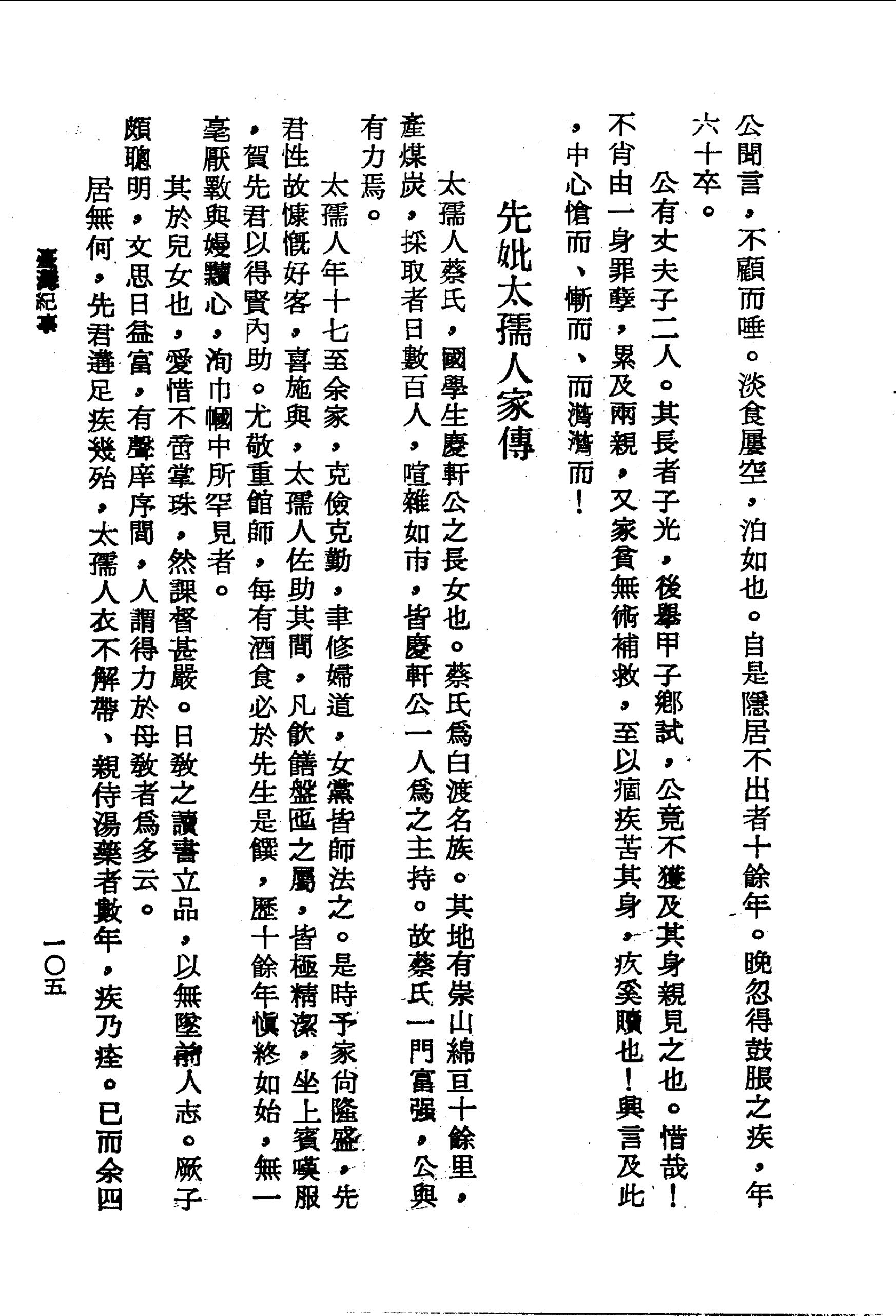 是時,其子縻餼臺庠,日有聲。然益困,轉徙流離,久之,至無卓錐地。猶聞公豪氣咄咄逼人,恆言曰:『吾有能文子在,奚患貧』?人以其屢譽兒也,私擬之王家癖;公聞言,不顧而唾。 自是隱居不出者十餘年。晚忽得鼓脹之疾,年六十卒。