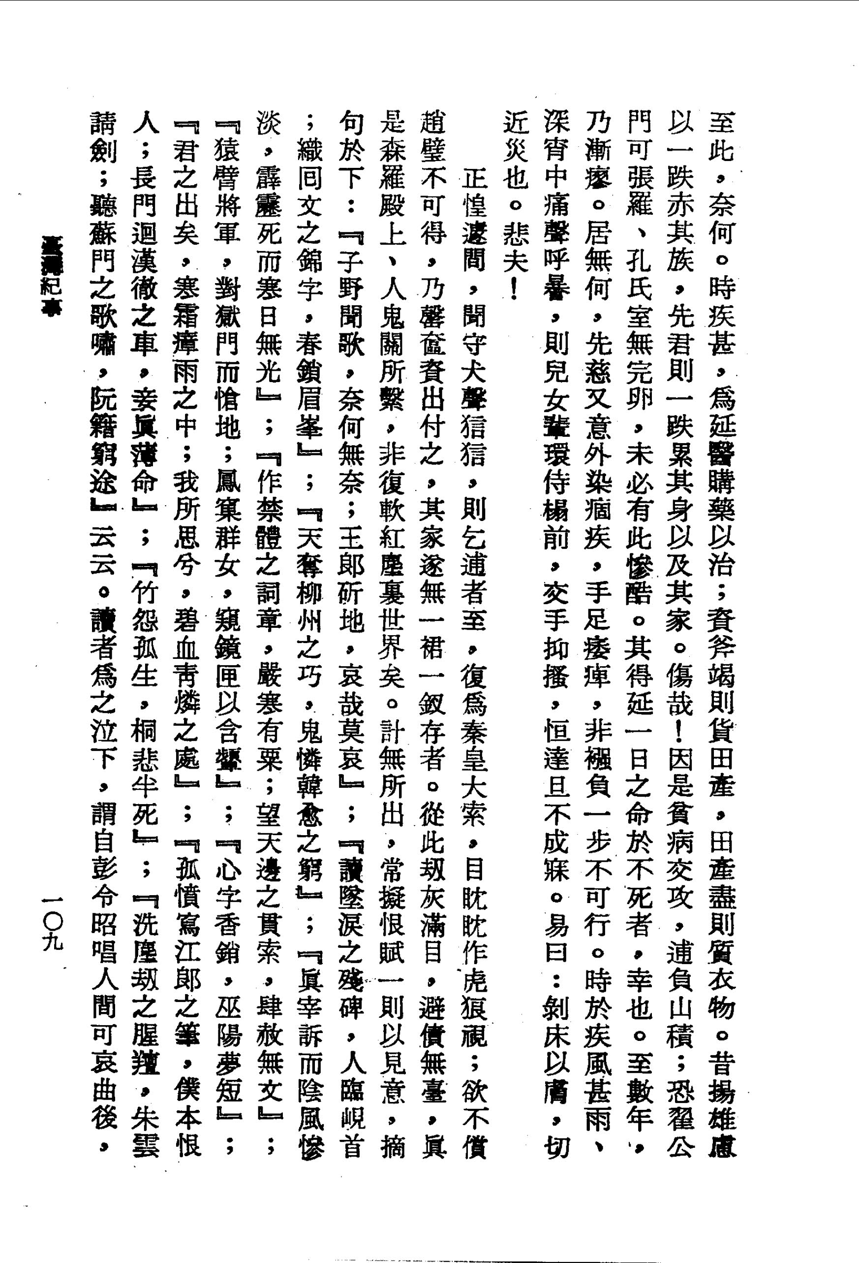 至今崇道重文諸行誼,嘖嘖士夫之口不衰。 然卒以好名貧其家。會遭傾跌,足傷幾殆。余按賈生云,非徒病瘇也,又苦炙盭至此,奈何。時疾甚,為延醫購藥以治;資斧竭則貨田產,田產盡則質衣物。昔揚雄慮以一跌赤其族,先君則一跌累其身以及其家。傷哉!因是貧病交攻,逋負山積;恐翟公門可張羅、孔氏室無完卵,未必有此慘酷。其得延一日之命於不死者,幸也。至數年,乃漸瘳。