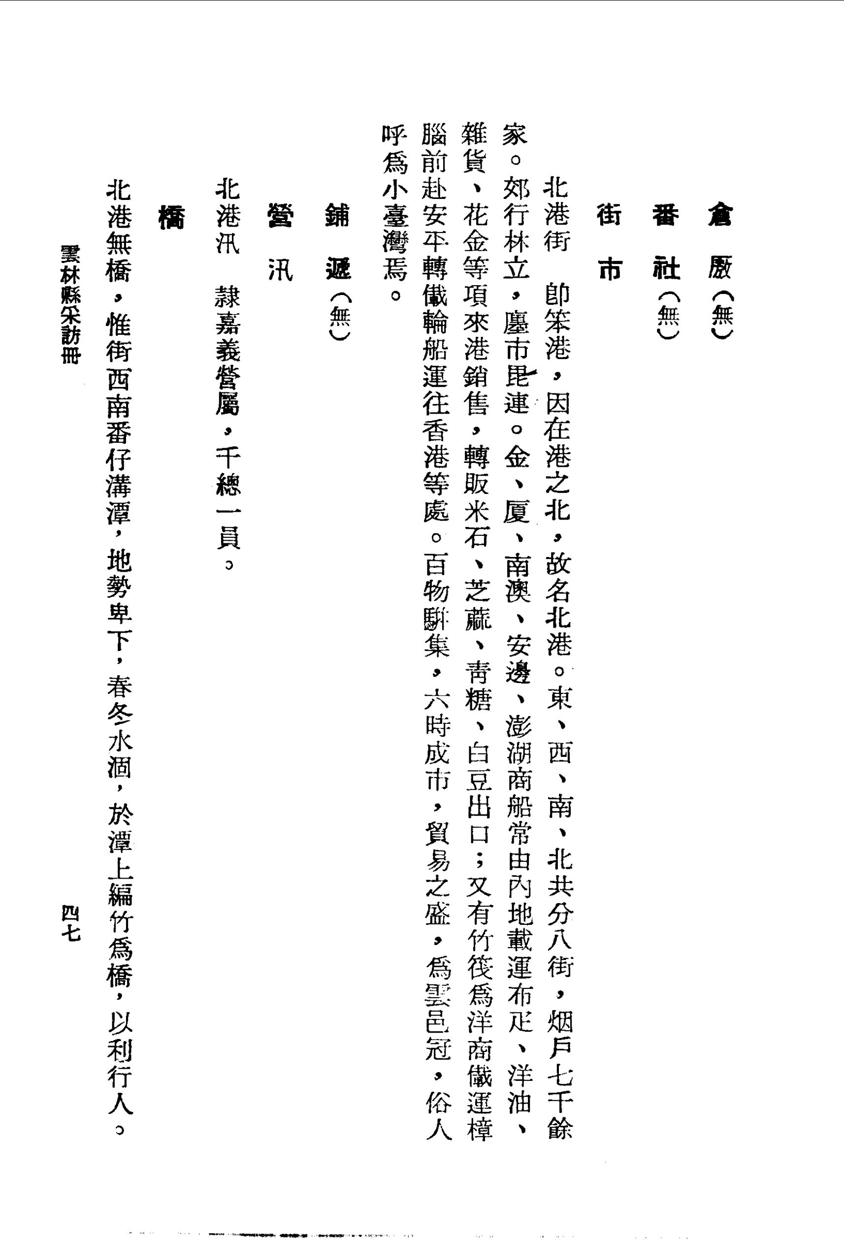 北港街 即笨港,因在港之北,故名北港。東、西、南、北共分八街,烟戶七千餘家。郊行林立,廛市毘連。金、廈、南澳、安邊、澎湖商船常由內地載運布疋、洋油、雜貨、花金等項來港銷售,轉販米石、芝蔴、青糖、白豆出口;又有竹筏為洋商儎運樟腦前赴安平轉儎輪船運往香港等處。百物駢集,六時成市,貿易之盛,為雲邑冠,俗人呼為小臺灣焉。