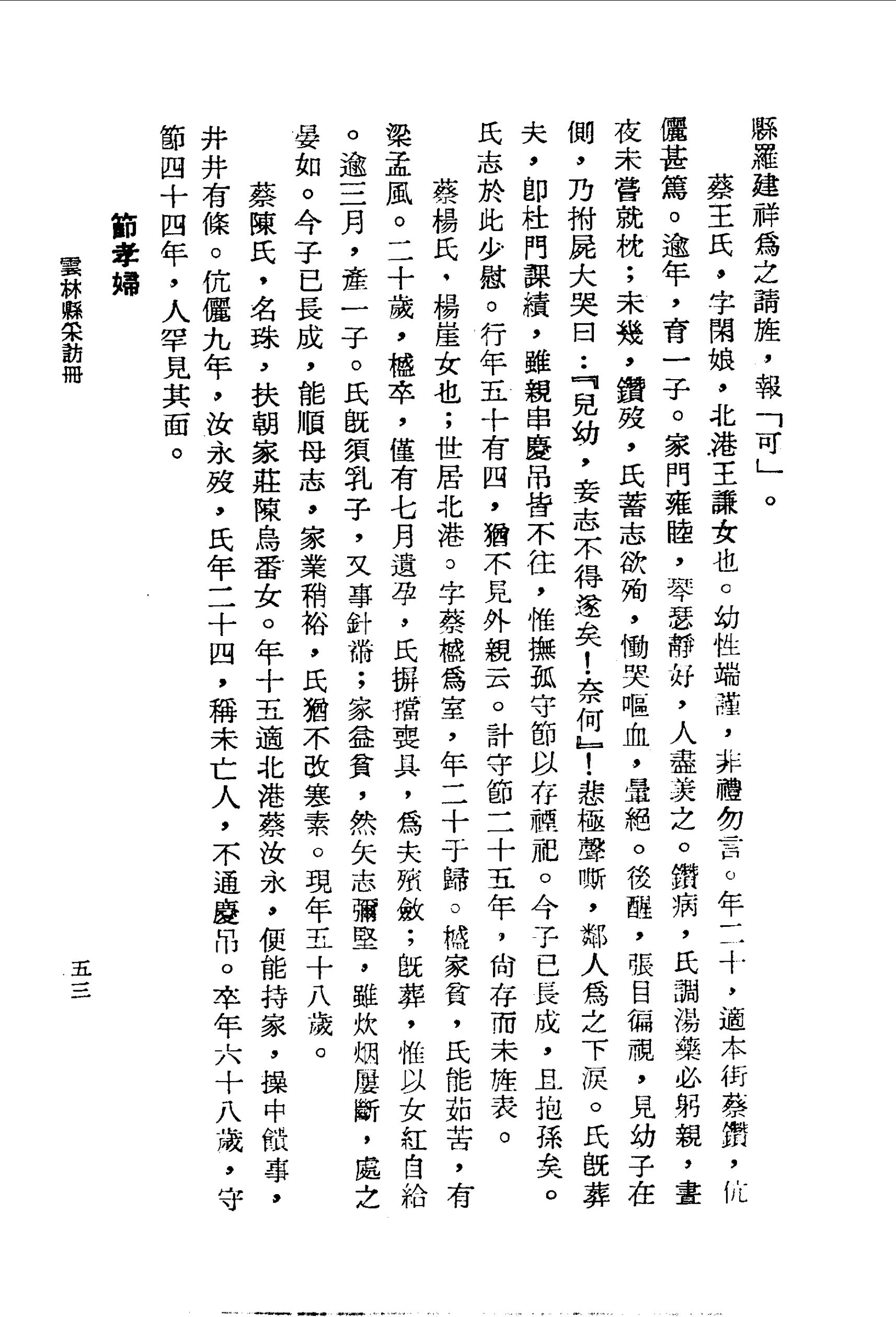 蔡王氏,字閑娘,北港王謙女也。幼性端謹,非禮勿言。年二十,適本街蔡鑽,伉儷甚篤。逾年,育一子。家門雍睦,琴瑟靜好,人盡羨之。鑽病,氏調湯藥必躬親,晝夜未嘗就枕;未幾,鑽歿,氏蓄志欲殉,慟哭嘔血,暈絕。後醒,張目遍視,見幼子在側,乃拊屍大哭曰:『兒幼,妾志不得遂矣!奈何』!悲極聲嘶,鄰人為之下淚。氏既葬夫,即杜門課績,雖親串慶吊皆不往,惟撫孤守節以存禋祀。今子已長成,且抱孫矣。氏志於此少慰。行年五十有四,猶不見外親云。計守節二十五年,尚存而未旌表。