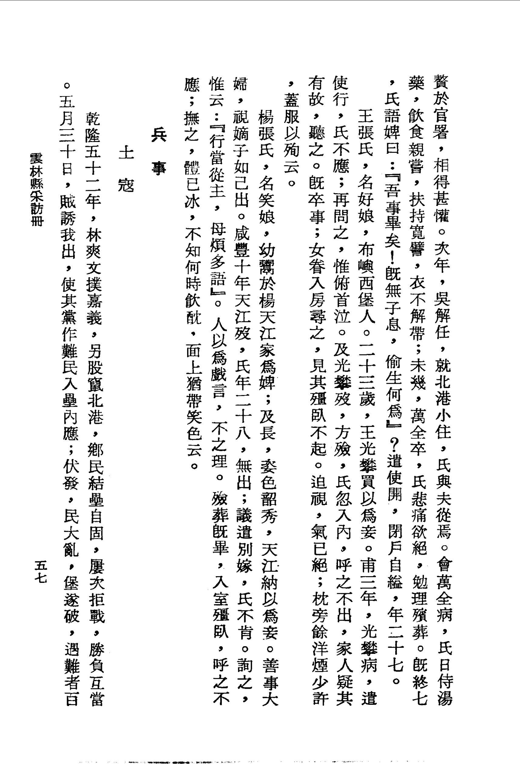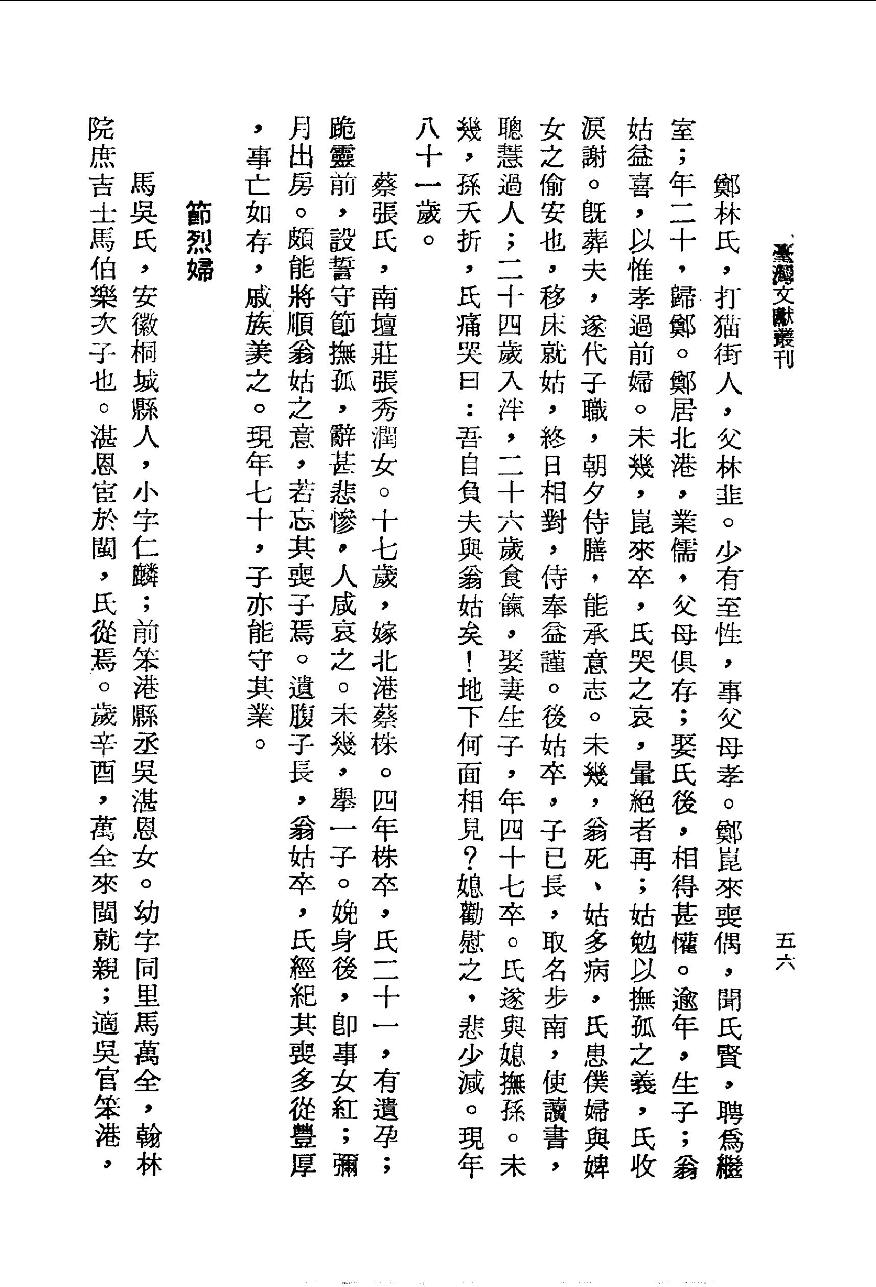 馬吳氏,安徽桐城縣人,小字仁麟;前笨港縣丞吳湛恩女。幼字同里馬萬全,翰林院庶吉士馬伯樂次子也。湛恩宦於閩,氏從焉。歲辛酉,萬全來閩就親;適吳官笨港, 贅於官署,相得甚懽。次年,吳解任,就北港小住,氏與夫從焉。會萬全病,氏日侍湯藥,飲食親嘗,扶持寬譬,衣不解帶;未幾,萬全卒,氏悲痛欲絕,勉理殯葬。既終七,氏語婢曰:『吾事畢矣!既無子息,偷生何為』?遣使開,閉戶自縊,年二十七。