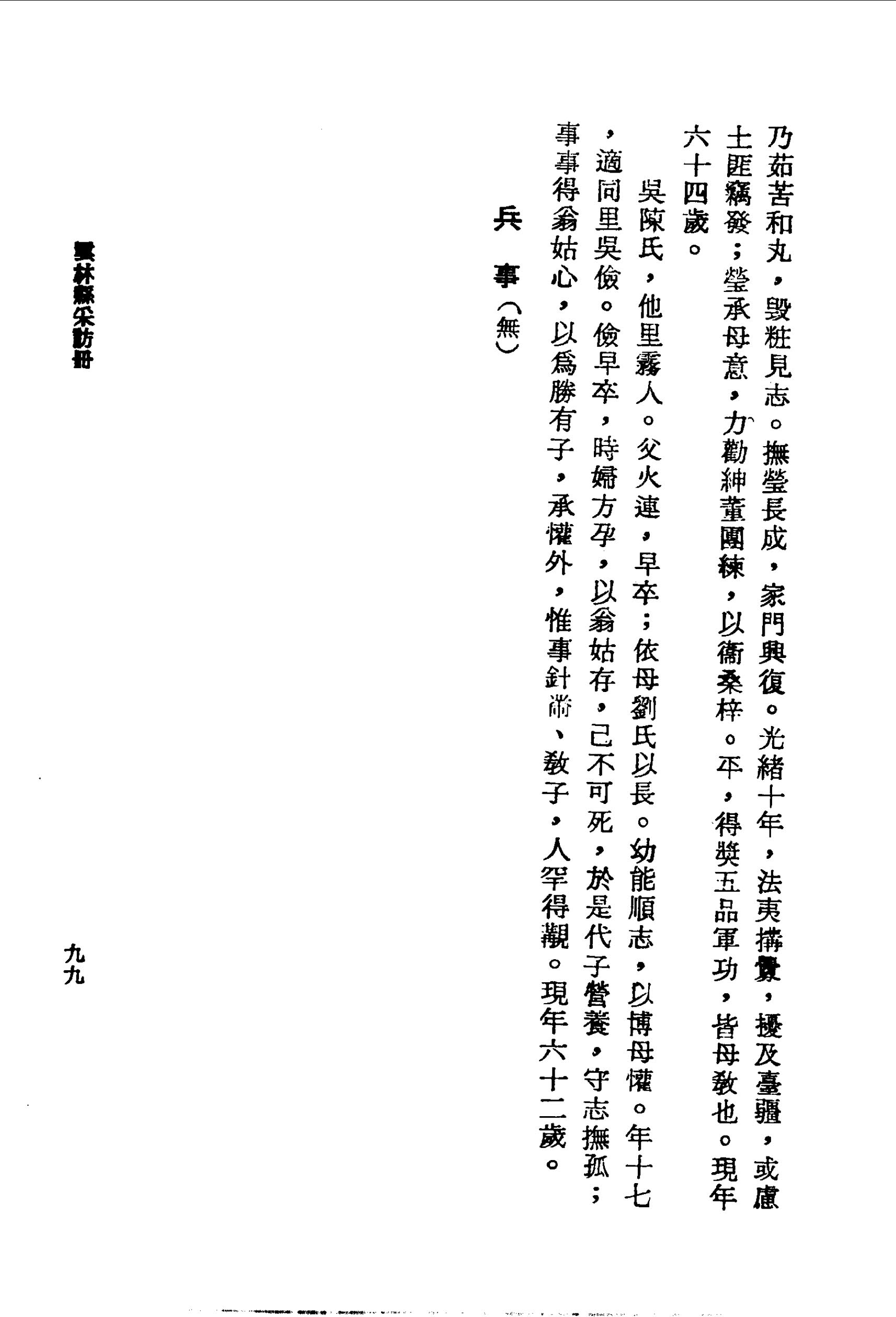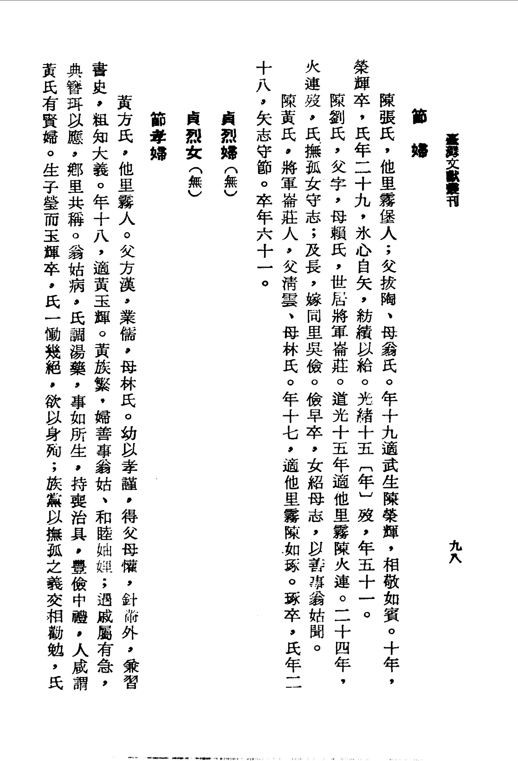黃方氏,他里霧人。父方漢,業儒,母林氏。幼以孝謹,得父母懽,針黹外,兼習書史,粗知大義。年十八,適黃玉輝。黃族繁,婦善事翁姑、和睦妯娌;遇戚屬有急,典簪珥以應,鄉里共稱。翁姑病,氏調湯藥,事如所生,持喪治具,豐儉中禮,人咸謂黃氏有賢婦。生子瑩而玉輝卒,氏一慟幾絕,欲以身殉;族黨以撫孤之義交相勸勉,氏乃茹苦和丸,毀粧見志。撫瑩長成,家門興復。
