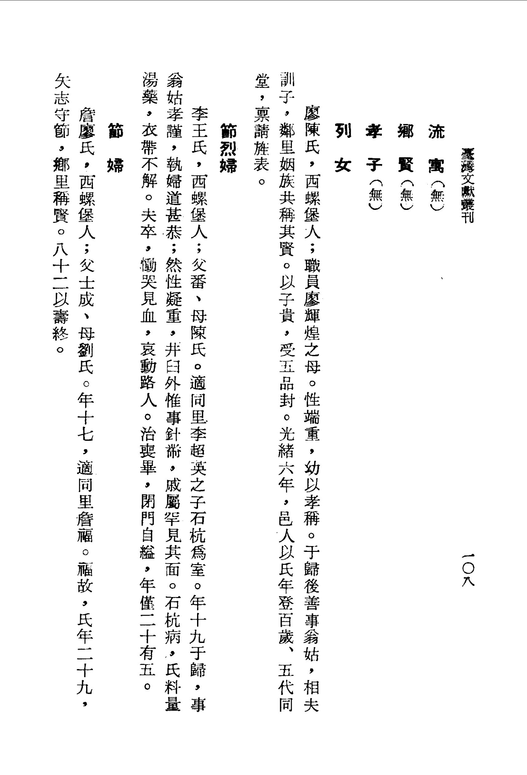 李王氏,西螺堡人;父番、母陳氏。適同里李超英之子石杭為室。年十九于歸,事翁姑孝謹,執婦道甚恭;然性凝重,井臼外惟事針黹,戚屬罕見其面。石杭病,氏料量湯藥,衣帶不解。夫卒,慟哭見血,哀動路人。治喪畢,閉門自縊,年僅二十有五。