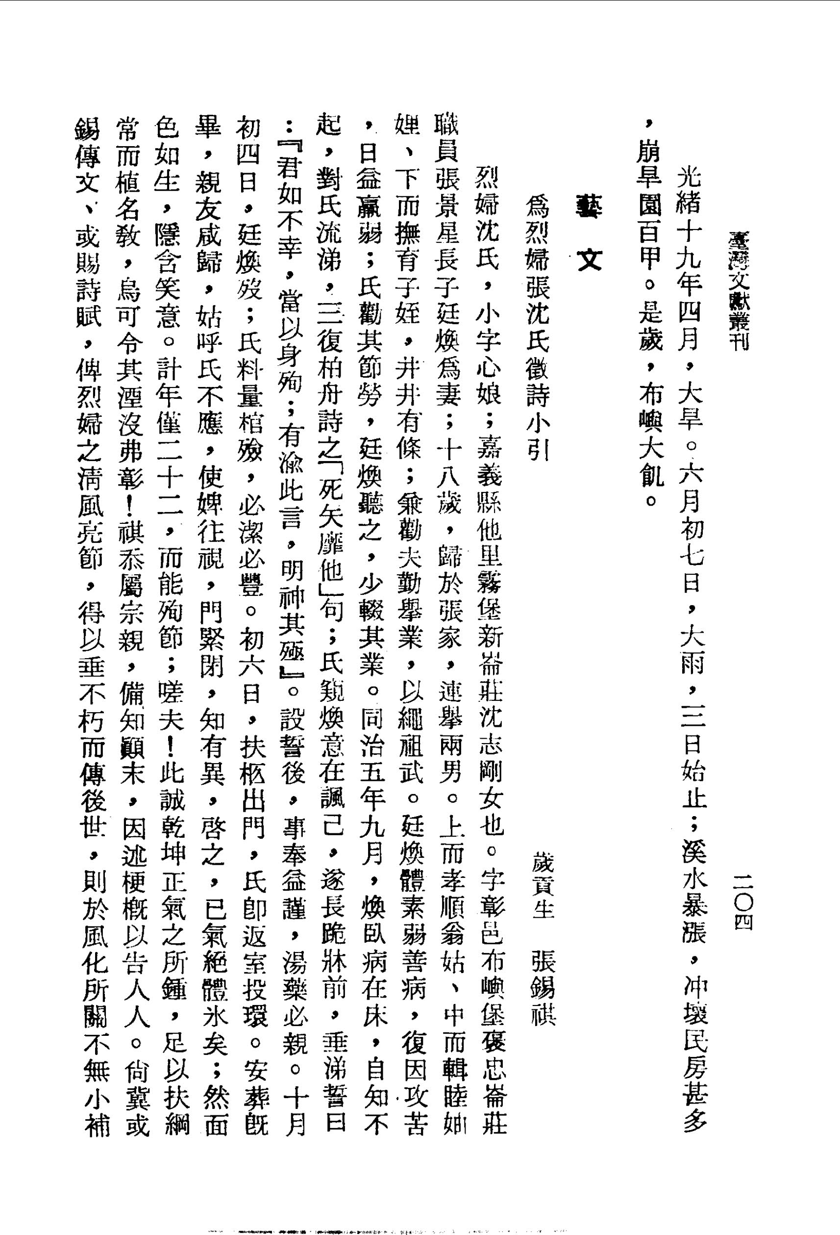 烈婦沈氏,小字心娘;嘉義縣他里霧堡新崙莊沈志剛女也。字彰邑布嶼堡褒忠崙莊職員張景星長子廷煥為妻;十八歲,歸於張家,連舉兩男。上而孝順翁姑、中而輯睦妯娌、下而撫育子姪,井井有條;兼勸夫勤舉業,以繩祖武。廷煥體素弱善病,復因攻苦,日益羸弱;氏勸其節勞,廷煥聽之,少輟其業。同治五年九月,煥臥病在床,自知不起,對氏流涕,三復柏舟詩之「死矢靡他」句;氏窺煥意在諷己,遂長跪床前,垂涕誓曰:『君如不幸,當以身殉;有渝此言,明神其殛』。設誓後,事奉益謹,湯藥必親。十月初四日,廷煥歿;氏料量棺殮,必潔必豐。初六日,扶柩出門,氏即返室投環。安葬既畢,親友咸歸,姑呼氏不應,使婢往視,門緊閉,知有異,啟之,已氣絕體冰矣;然面色如生,隱含笑意。計年僅二十二,而能殉節;嗟夫!此誠乾坤正氣之所鍾,足以扶綱常而植名教,烏可令其湮沒弗彰!祺忝屬宗親,備知顛末,因述梗概以告人人。