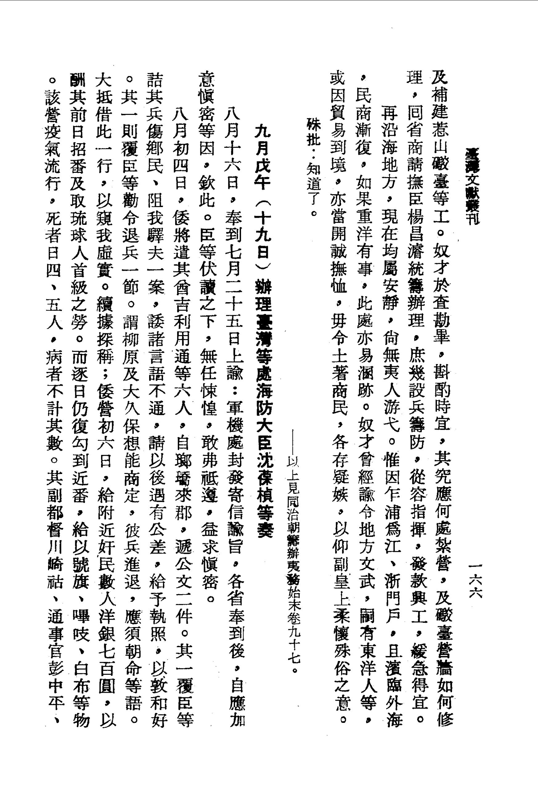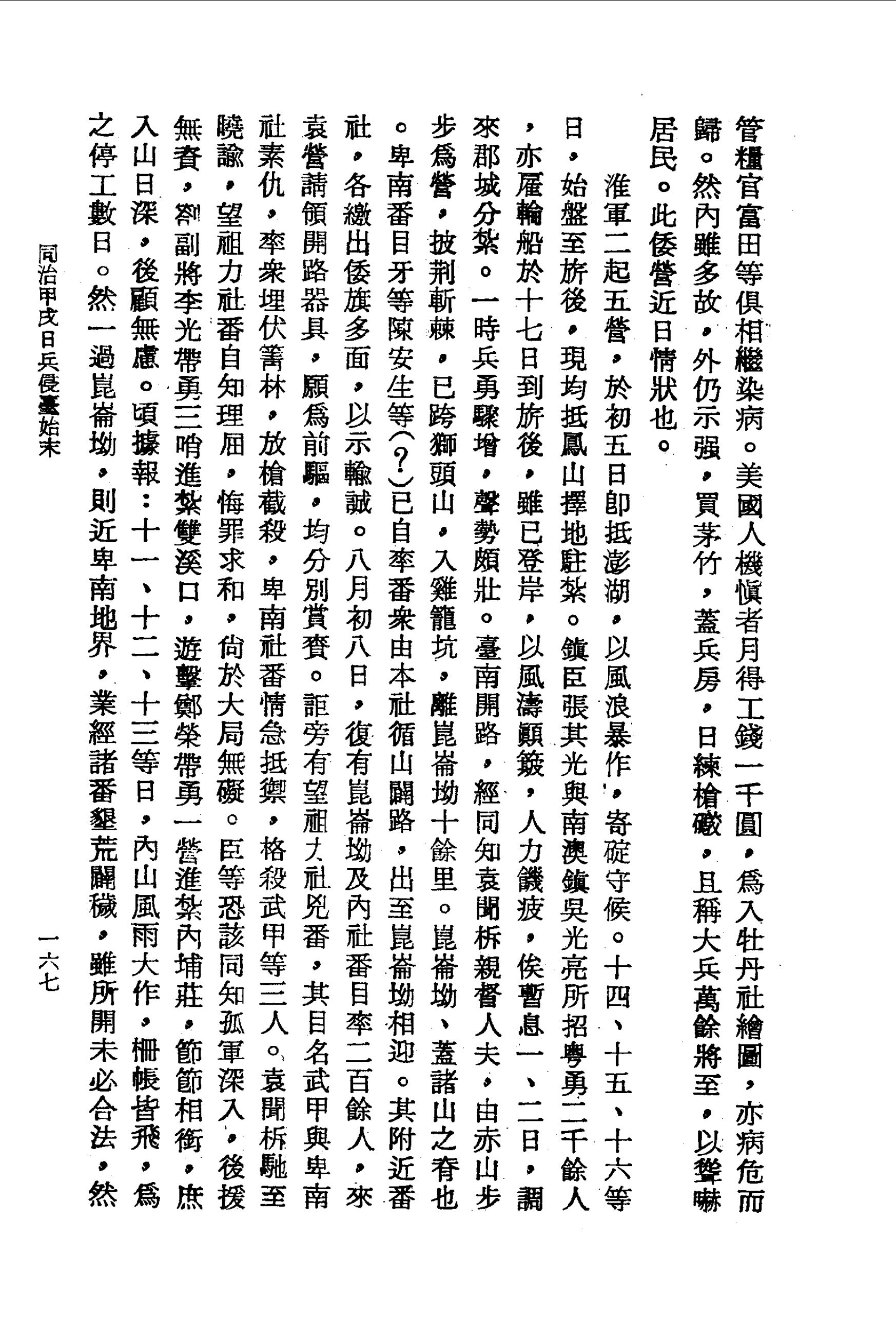 該營疫氣流行,死者日四、五人,病者不計其數。其副都督川崎祜、通事官彭中平、管糧官富田等俱相繼染病。美國人機慎者月得工錢一千圓,為入牡丹社繪圖,亦病危而歸。然內雖多故,外仍示強,買茅竹,蓋兵房,日練槍礮,且稱大兵萬餘將至,以聳嚇居民。此倭營近日情狀也。