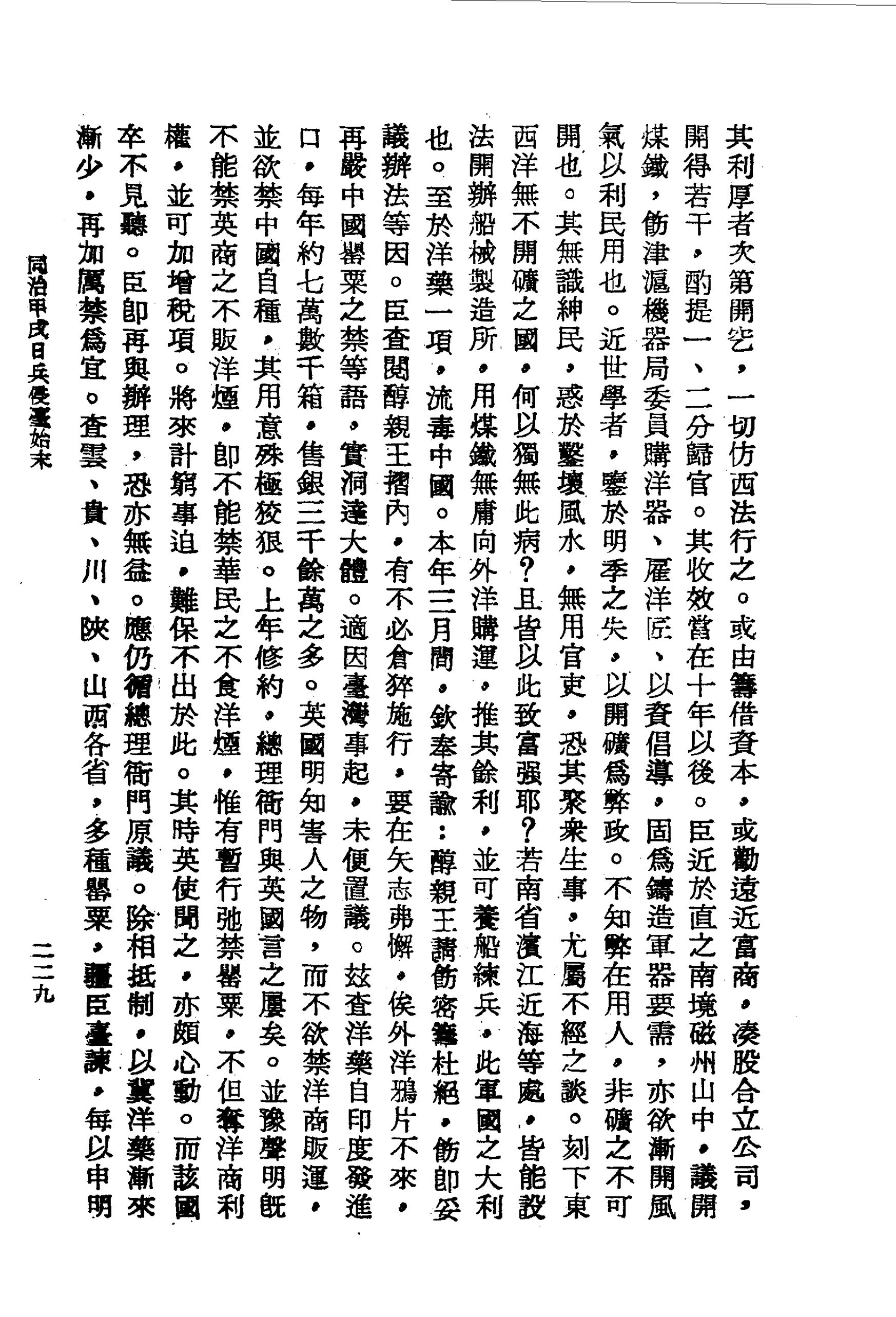 至於洋藥一項,流毒中國。本年三月間,欽奉寄諭:醇親王請飭密籌杜絕,飭即妥議辦法等因。臣查閱醇親王摺內,有不必倉猝施行,要在矢志弗懈,俟外洋鴉片不來,再嚴中國罌粟之禁等語,實洞達大體。適因臺灣事起,未便置議。茲查洋藥自印度發進口,每年約七萬數千箱,售銀三千餘萬之多。英國明知害人之物,而不欲禁洋商販運,並欲禁中國自種,其用意殊極狡狠。上年修約,總理衙門與英國言之屢矣。並豫聲明既不能禁英商之不販洋煙,即不能禁華民之不食洋煙,惟有暫行弛禁罌粟,不但奪洋商利權,並可加增稅項。將來計窮事迫,難保不出於此。其時英使聞之,亦頗心動。而該國卒不見聽。臣即再與辦理,恐亦無益。應仍循總理衙門原議。除相抵制,以冀洋藥漸來漸少,再加厲禁為宜。
