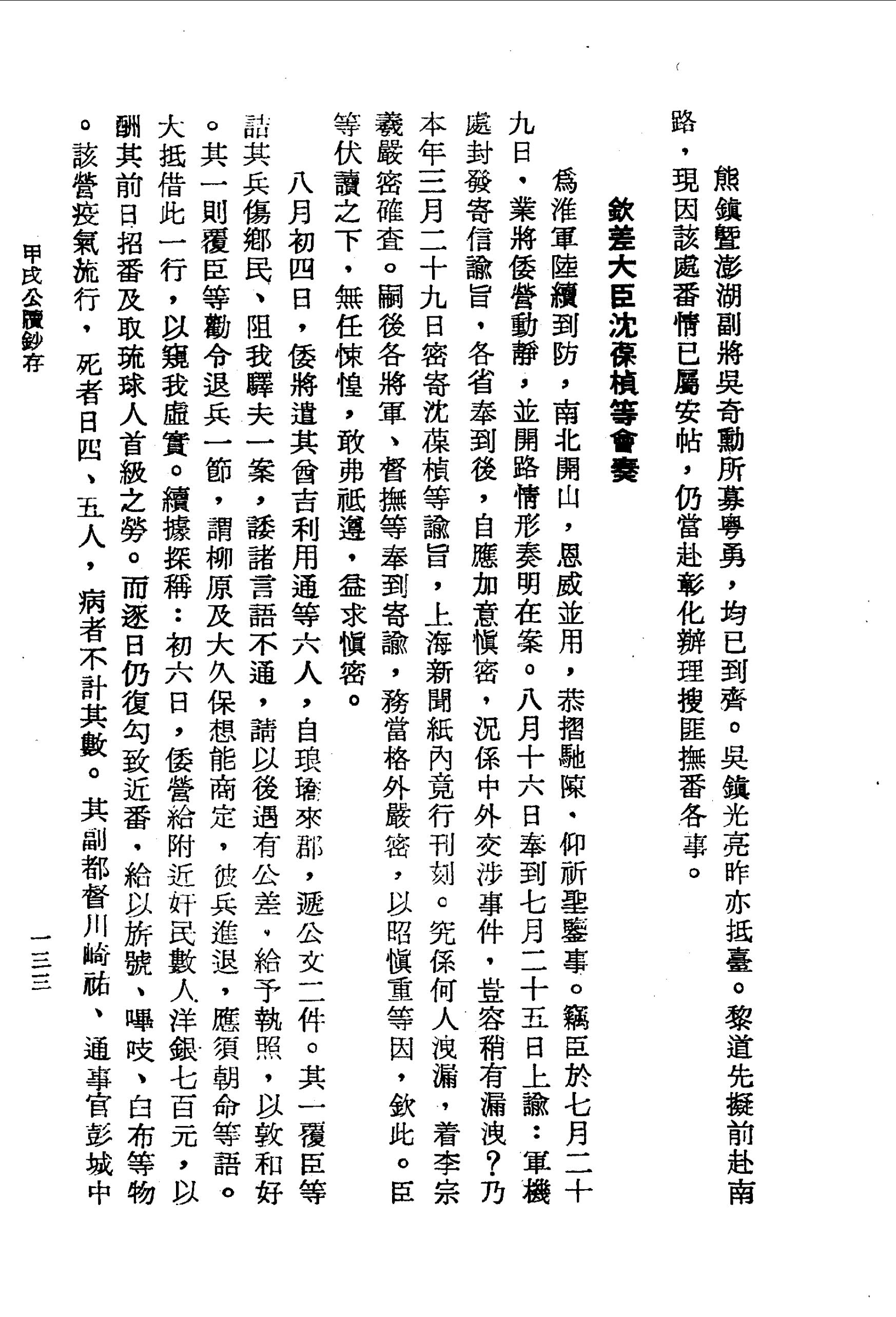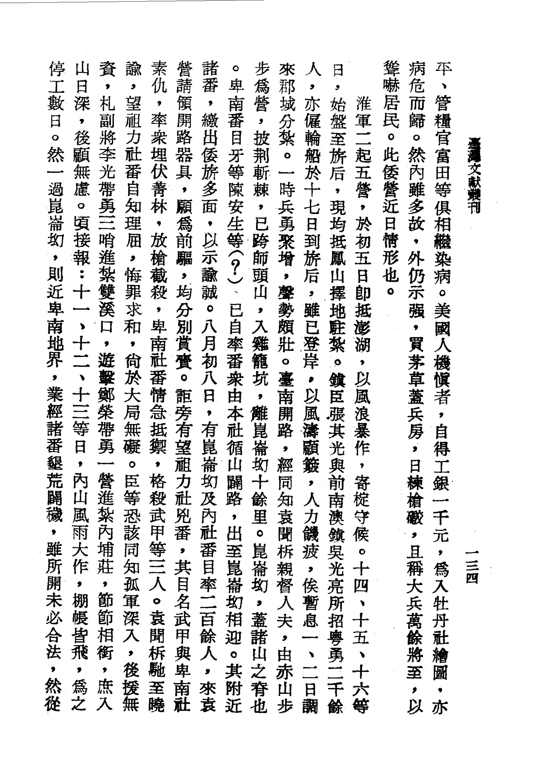 該營疫氣流行,死者日四、五人,病者不計其數。其副都督川崎祐、通事官彭城中平、管糧官富田等俱相繼染病。美國人機慎者,自得工銀一千元,為入牡丹社繪圖,亦病危而歸。然內雖多故,外仍示強,買茅草蓋兵房,日練槍礮,且稱大兵萬餘將至,以聳嚇居民。此倭營近日情形也。