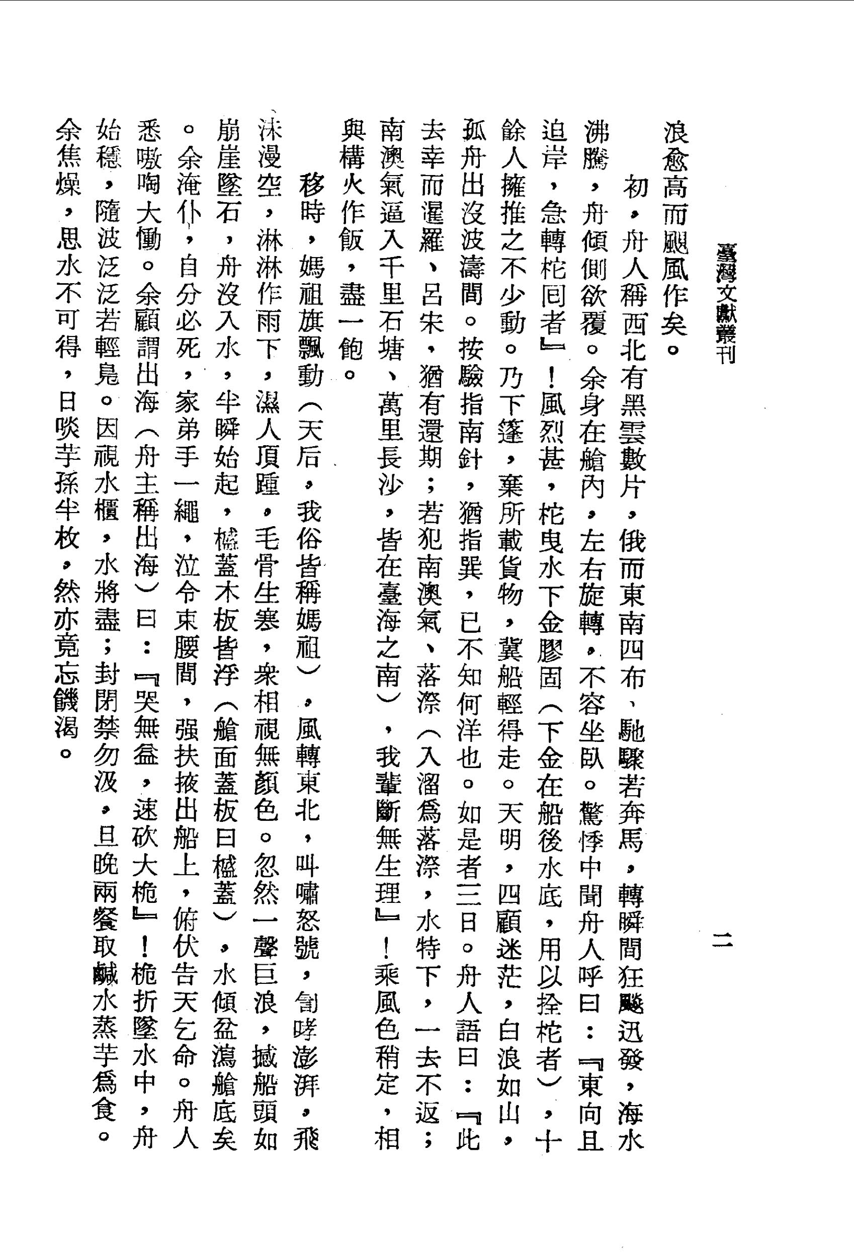 余顧謂出海(舟主稱出海)曰:『哭無益,速砍大桅』!桅折墜水中,舟始穩,隨波泛泛若輕鳧。 因視水櫃,水將盡;封閉禁勿汲,旦晚兩餐取鹹水蒸芋為食。余焦燥,思水不可得,日啖芋孫半枚,然亦竟忘饑渴。