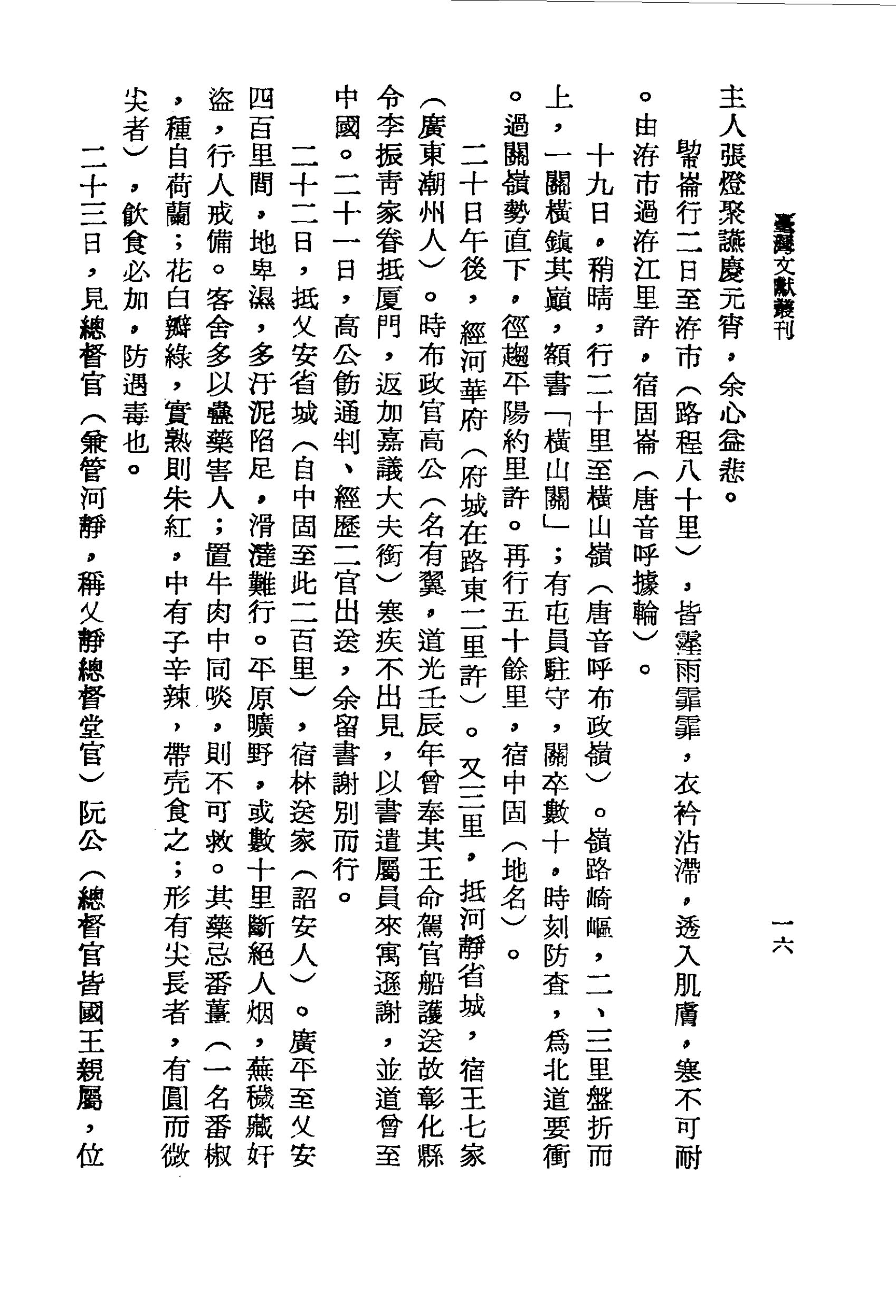 廣平至乂安四百里間,地卑濕,多汙泥陷足,滑澾難行。平原曠野,或數十里斷絕人煙,蕪穢藏奸盜,行人戒備。 客舍多以蠱藥害人;置牛肉中同啖,則不可救。其藥忌番薑(一名番椒,種自荷蘭;花白瓣綠,實熟則朱紅,中有子辛辣,帶壳食之;形有尖長者,有圓而微尖者),飲食必加,防遇毒也。