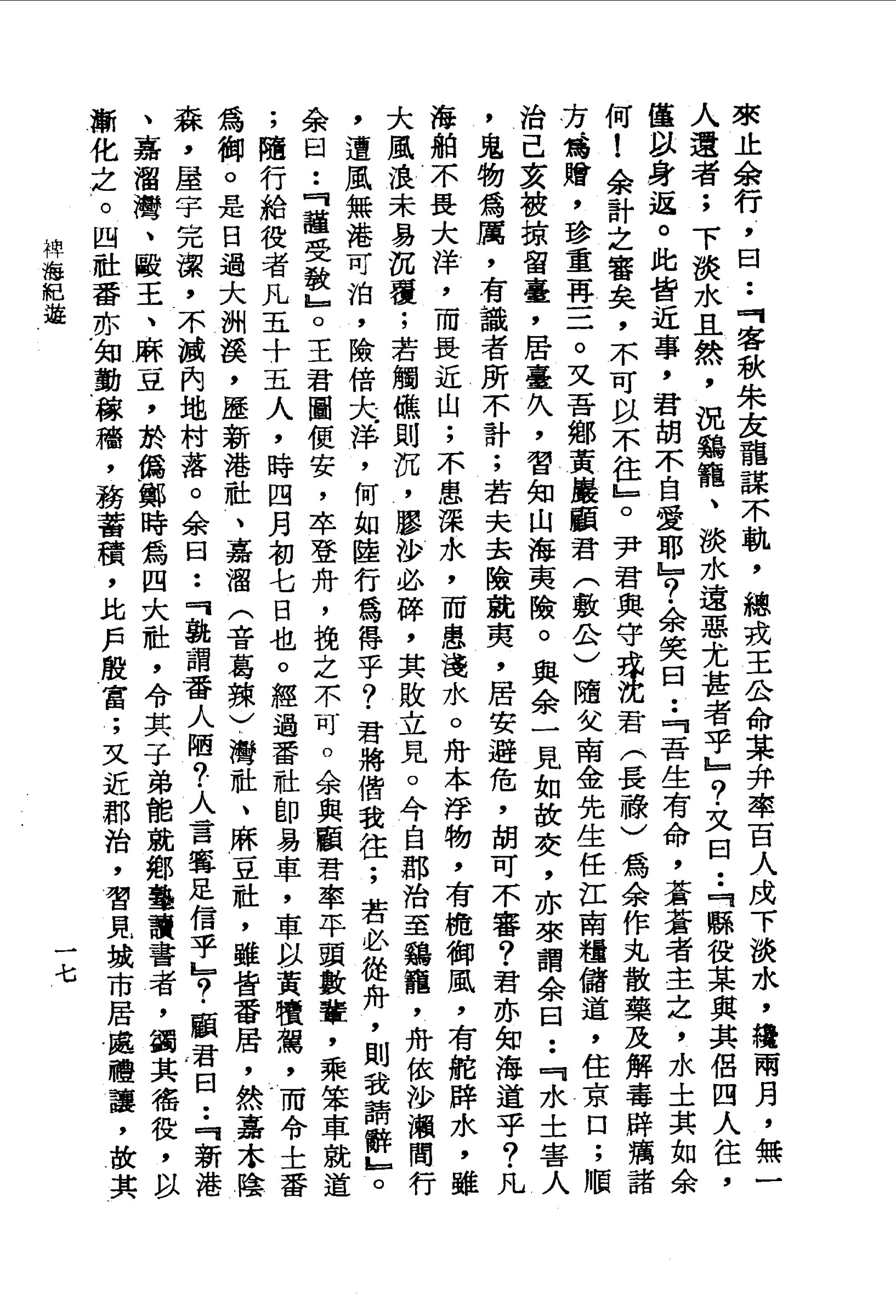 來止余行,曰:『客秋朱友龍謀不軌,總戎王公命某弁率百人戍下淡水,纔兩月,無一人還者;下淡水且然,況雞籠、淡水遠惡尤甚者乎』?又曰:『縣役某與其侶四人往,僅以身返。此皆近事,君胡不自愛耶』?余笑曰:『吾生有命,蒼蒼者主之,水土其如余何!余計之審矣,不可以不往』。尹君與守戎沈君(長祿)為余作丸散藥及解毒辟癘諸方為贈,珍重再三。又吾鄉黃巖顧君(敷公)隨父南金先生任江南糧儲道,住京口;順治己亥被掠留臺,居臺久,習知山海夷險。