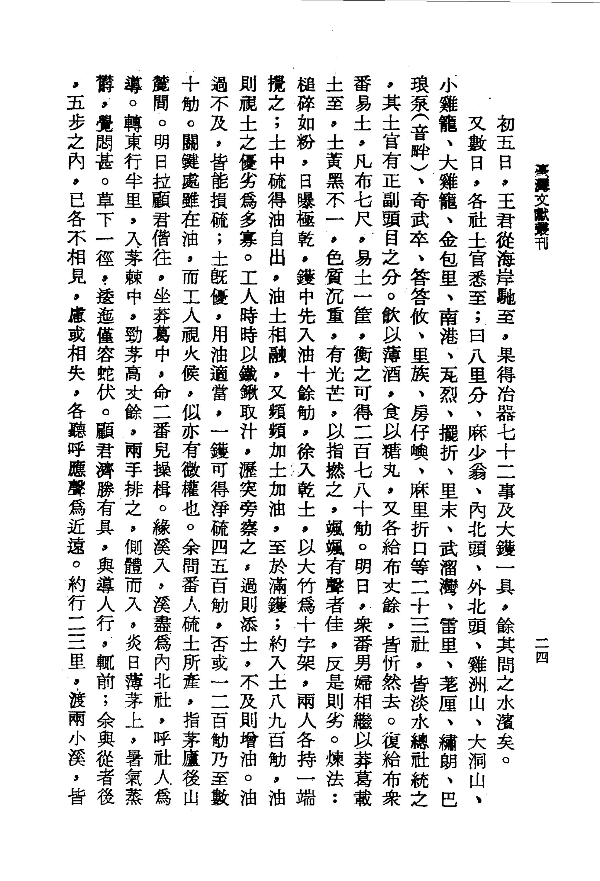 余問番人硫土所產,指茅廬後山麓間。明日拉顧君偕往,坐莽葛中,命二番兒操楫。緣溪入,溪盡為內北社,呼社人為導。轉東行半里,入茅棘中,勁茅高丈餘,兩手排之,側體而入,炎日薄茅上,暑氣蒸欝,覺悶甚。草下一徑,逶迤僅容蛇伏。