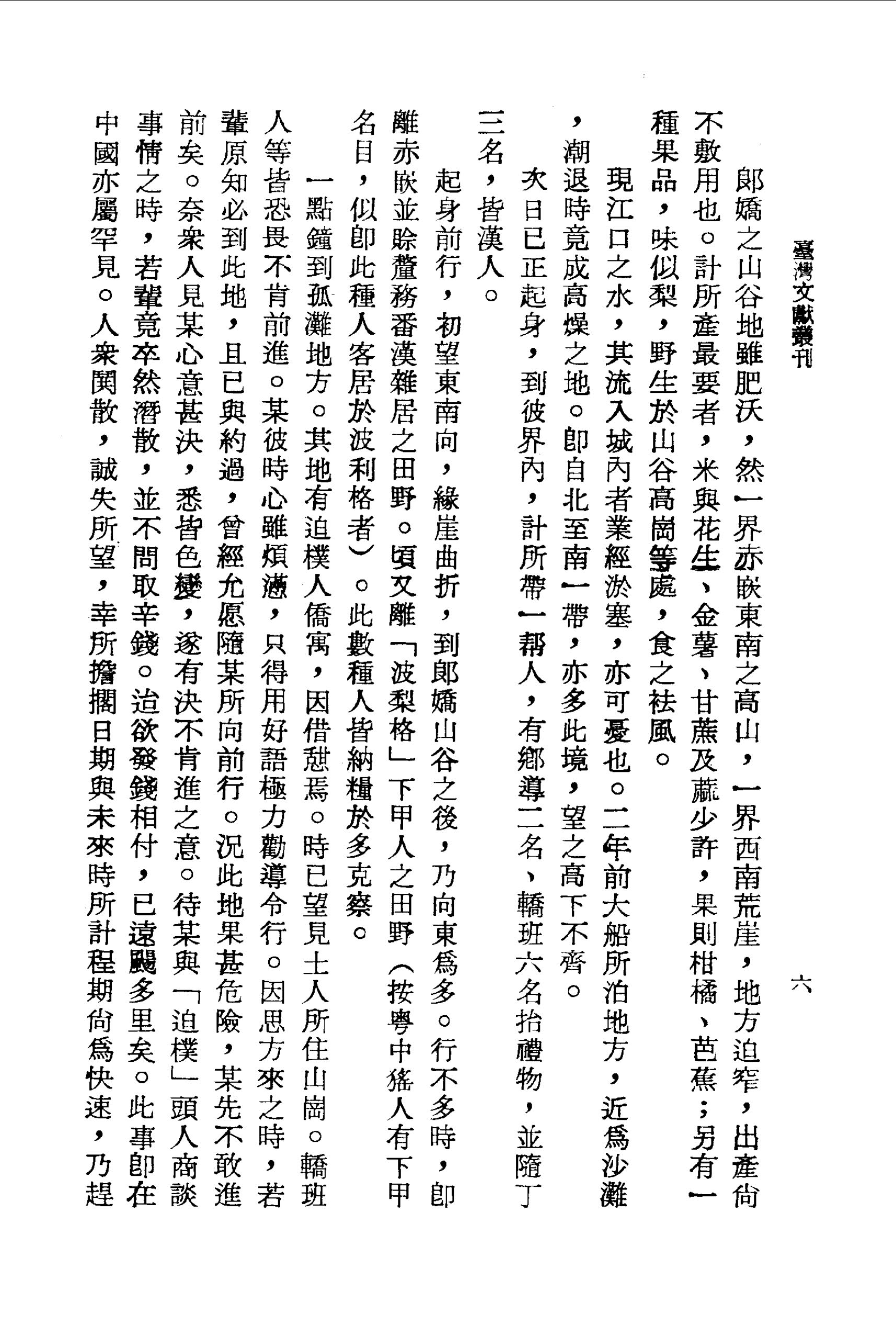 郎嬌之山谷地雖肥沃,然一界赤崁東南之高山,一界西南荒崖,地方迫窄,出產尚不敷用也。計所產最要者,米與花生、金薯、甘蔗及蔴少許,果則柑橘、芭蕉;另有一種果品,味似梨,野生於山谷高崗等處,食之袪風。