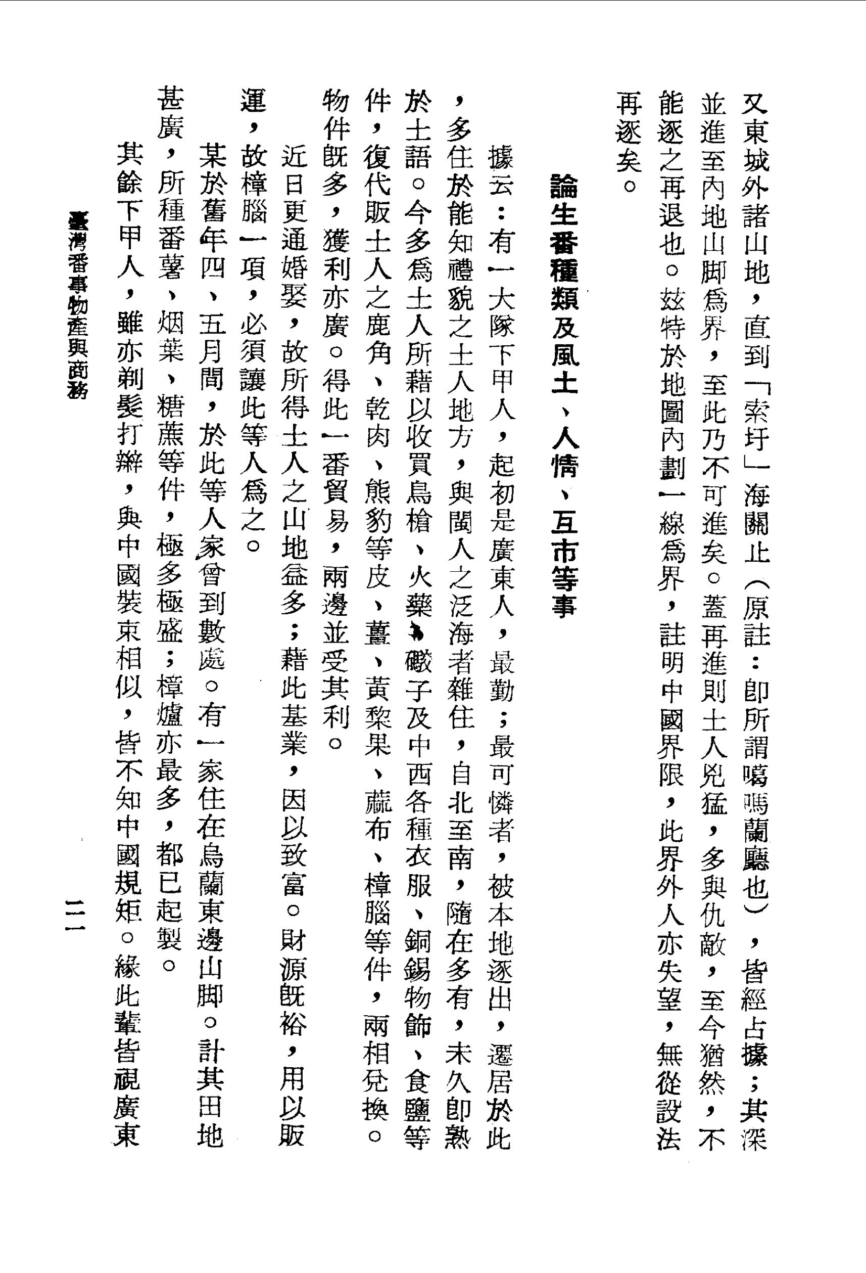 據云:有一大隊下甲人,起初是廣東人,最勤;最可憐者,被本地逐出,遷居於此,多住於能知禮貌之土人地方,與閩人之泛海者雜住,自北至南,隨在多有,未久即熟於土語。今多為土人所藉以收買鳥槍、火藥、礮子及中西各種衣服、銅錫物飾、食鹽等件,復代販土人之鹿角、乾肉、熊豹等皮、薑、黃梨果、蔴布、樟腦等件,兩相兌換。物件既多,獲利亦廣。得此一番貿易,兩邊並受其利。近日更通婚娶,故所得土人之山地益多;藉此基業,因以致富。財源既裕,用以販運,故樟腦一項,必須讓此等人為之。