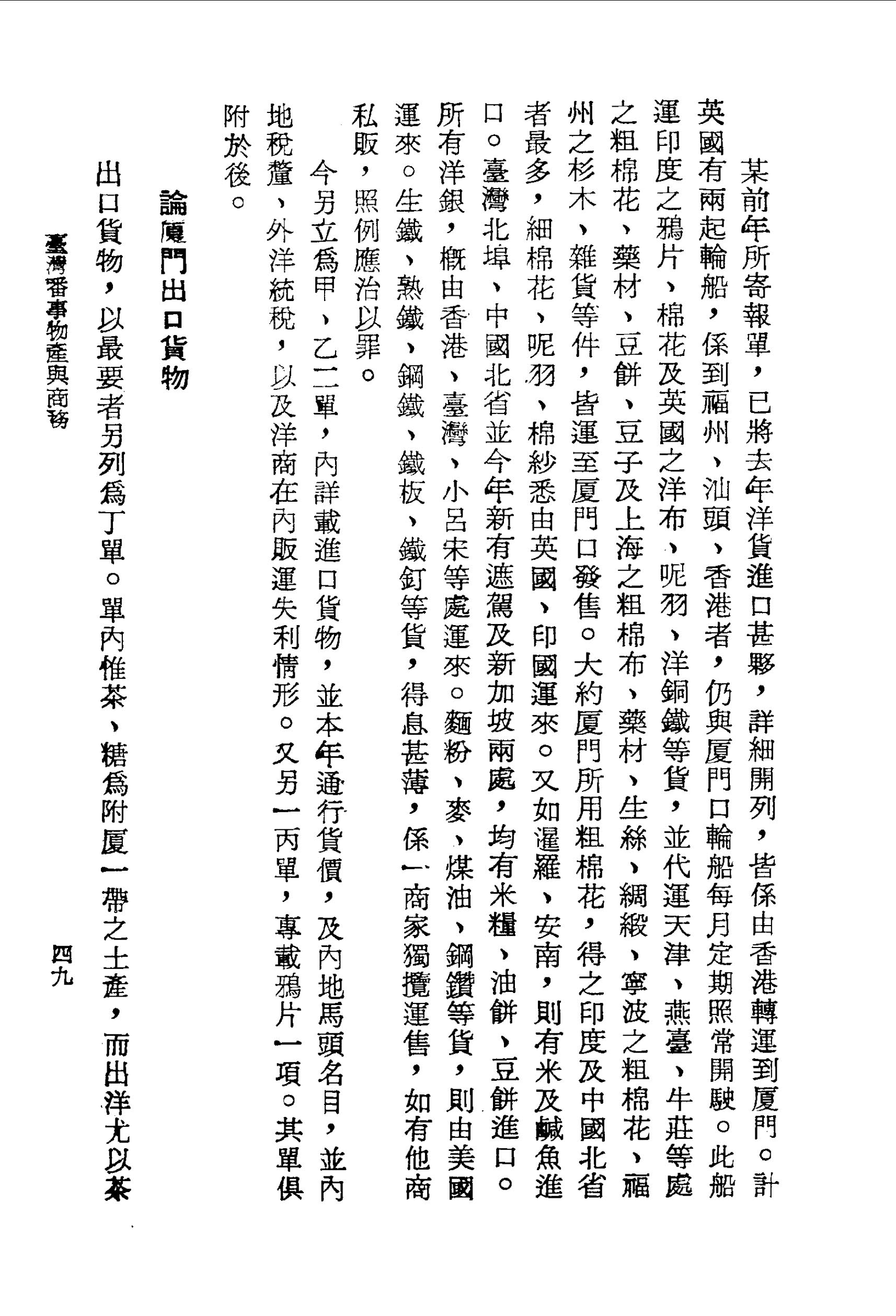臺灣北埠有出產最要貨物,如樟腦、烏龍茶,若許出口到花旂地方,可令花旂人利息加增,從前虧本事情,皆有轉機。從前所望生理日暢者,其先原指望此事耳。