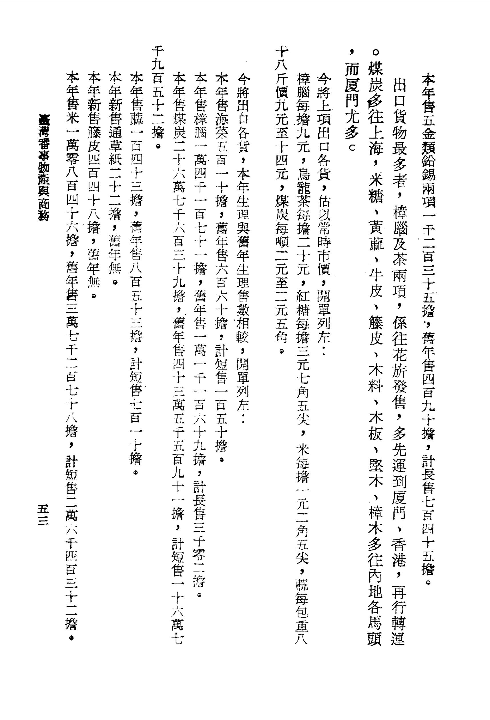 今將上項出口各貨,估以常時市價,開單列左:樟腦每擔九元,烏龍茶每擔二十元,紅糖每擔三元七角五尖,米每擔一元二角五尖,蔴每包重八十八斤價九元至十四元,煤炭每噸二元至二元五角。