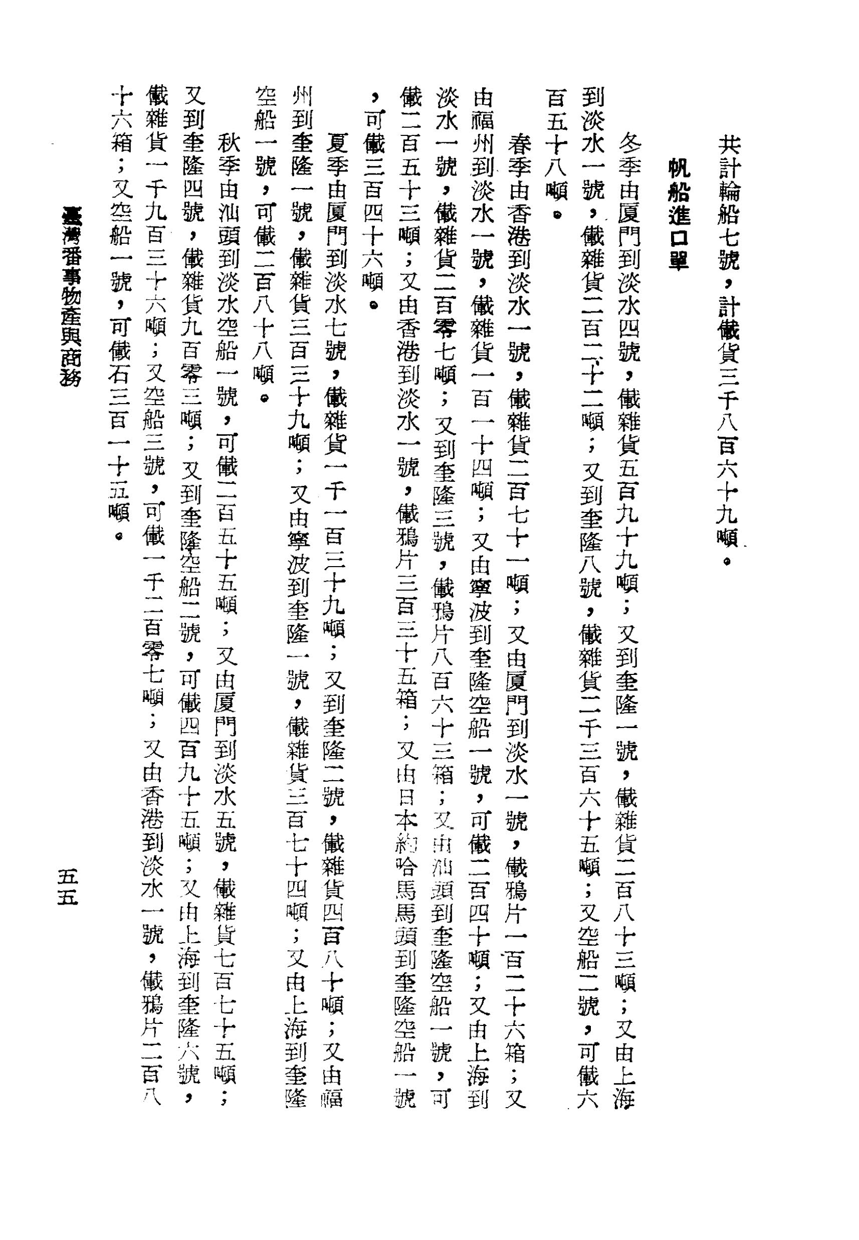 冬季由廈門到淡水四號,儎雜貨五百九十九噸;又到奎隆一號,儎雜貨二百八十三噸;又由上海到淡水一號,儎雜貨二百二十二噸;又到奎隆八號,儎雜貨二千三百六十五噸;又空船二號,可儎六百五十八噸。
