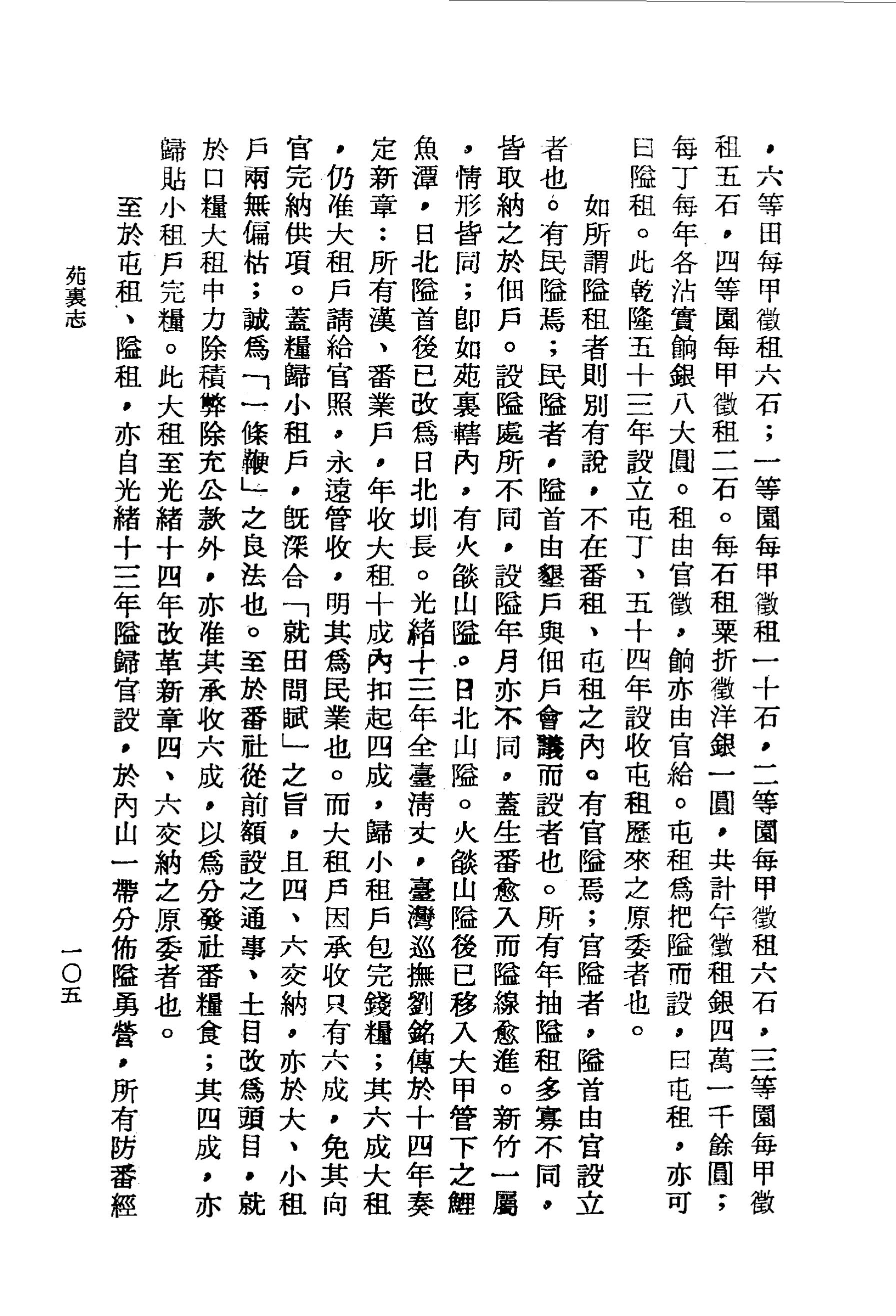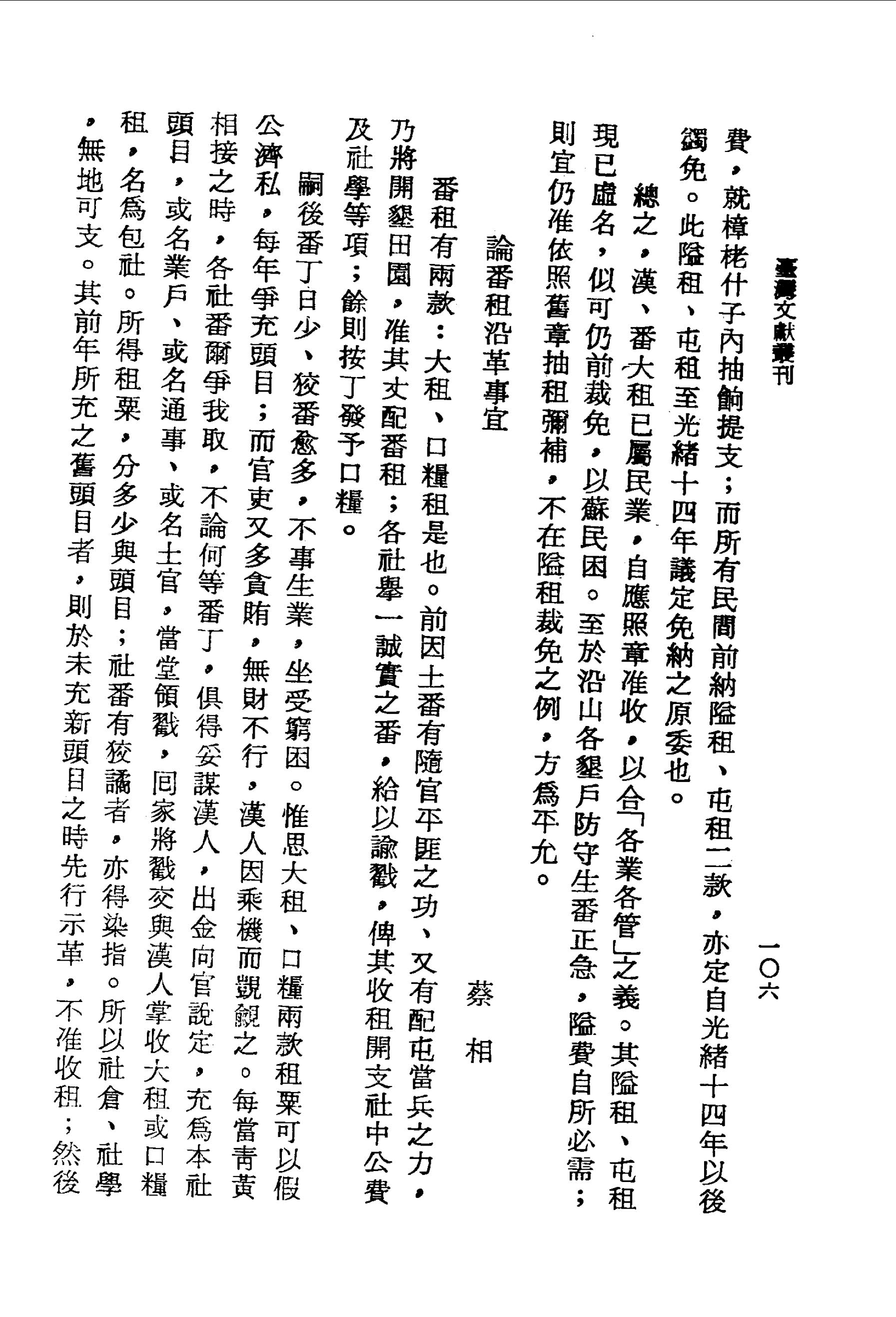 總之,漢、番大租已屬民業,自應照章准收,以合「各業各管」之義。其隘租、屯租現已虛名,似可仍前裁免,以蘇民困。至於沿山各墾戶防守生番正急,隘費自所必需;則宜仍准依照舊章抽租彌補,不在隘租裁免之例,方為平允。